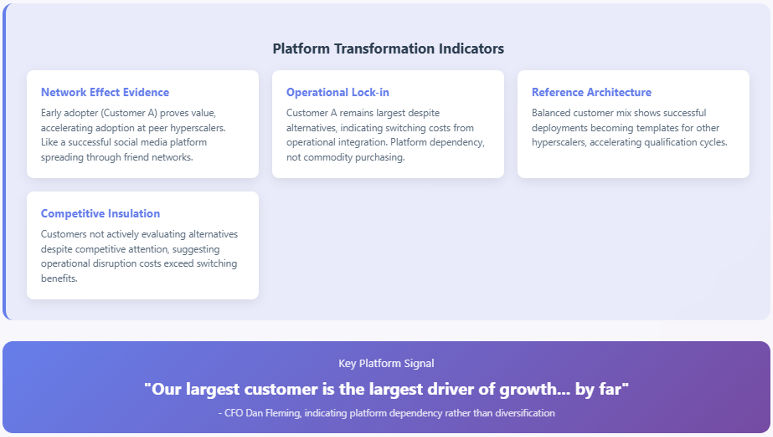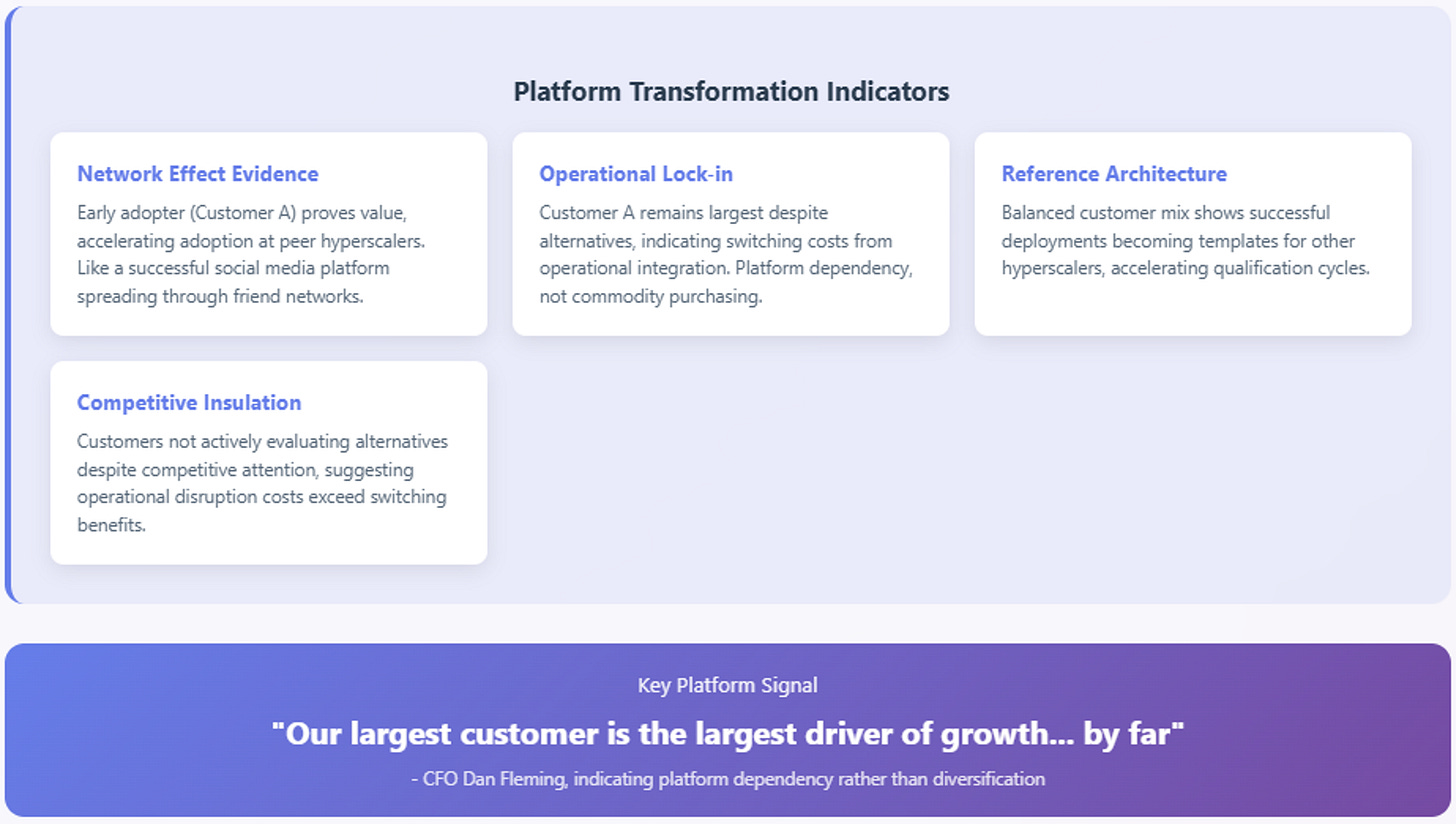 Consider the customer concentration evolution. Traditional semiconductor analysis views this as positive diversification reducing business risk—like a restaurant getting more customers instead of depending on a few regulars. Platform analysis sees it as network effects validation—early adopters proving operational benefits that accelerate adoption among peers, like how early smartphone users convinced their friends to get smartphones too.