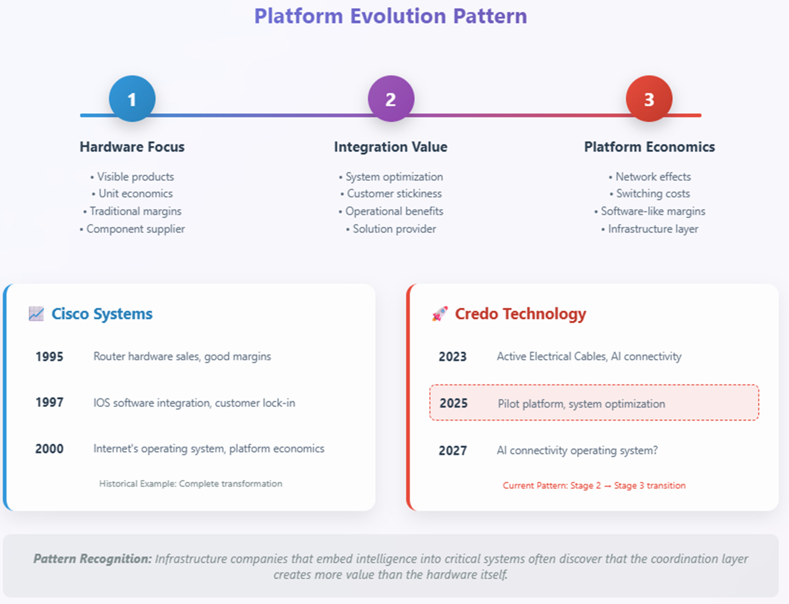 For investors willing to bet on platform pattern repetition, the asymmetric opportunity resembles what Cisco offered in 1995—the chance to own the essential coordination layer for the next phase of technological infrastructure. The steel rails were impressive, but the wealth creation came from making them intelligent. Today, Credo's cables are impressive, but the real opportunity lies in the operational intelligence that makes AI connectivity work reliably at the scale the future demands.