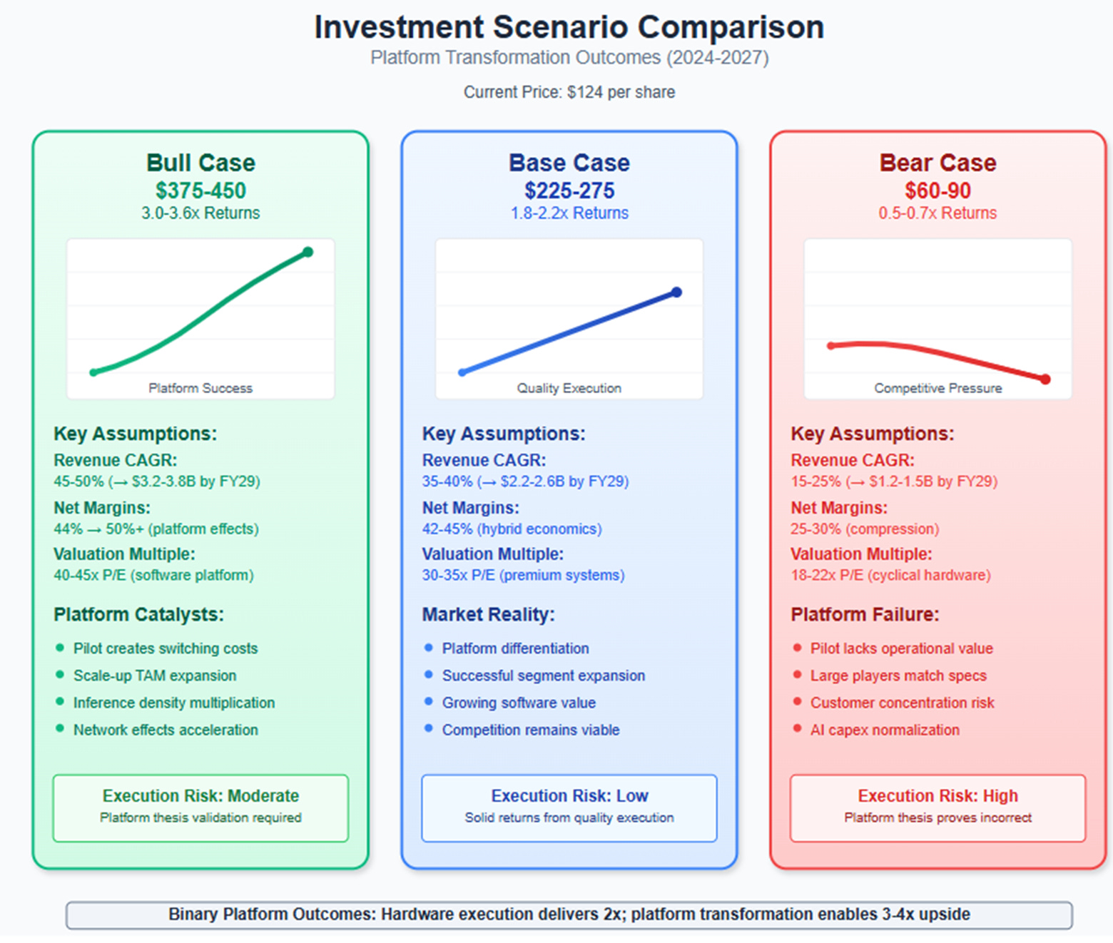 The bear case assumes competitive pressure undermines platform aspirations, like how many companies claimed to be "the Uber of X" but failed to create lasting advantages. Revenue growth decelerating to 15-25% with margin compression would reflect traditional hardware economics, pointing toward $60-90 per share.