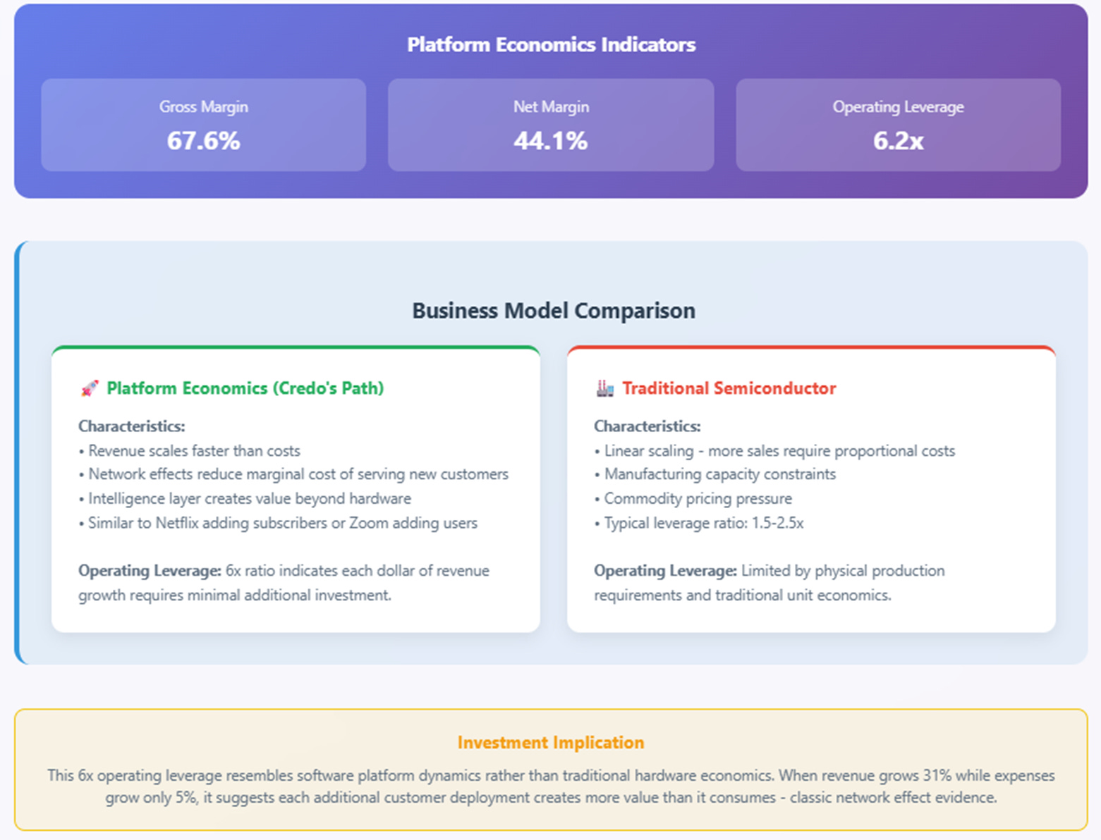 Each successful deployment generates operational intelligence that improves performance for all other customers. This is classic platform dynamics: Facebook became more valuable as more friends joined, Uber improved as more drivers and riders used the network, and Credo's connectivity solutions become more intelligent as more hyperscalers deploy them.