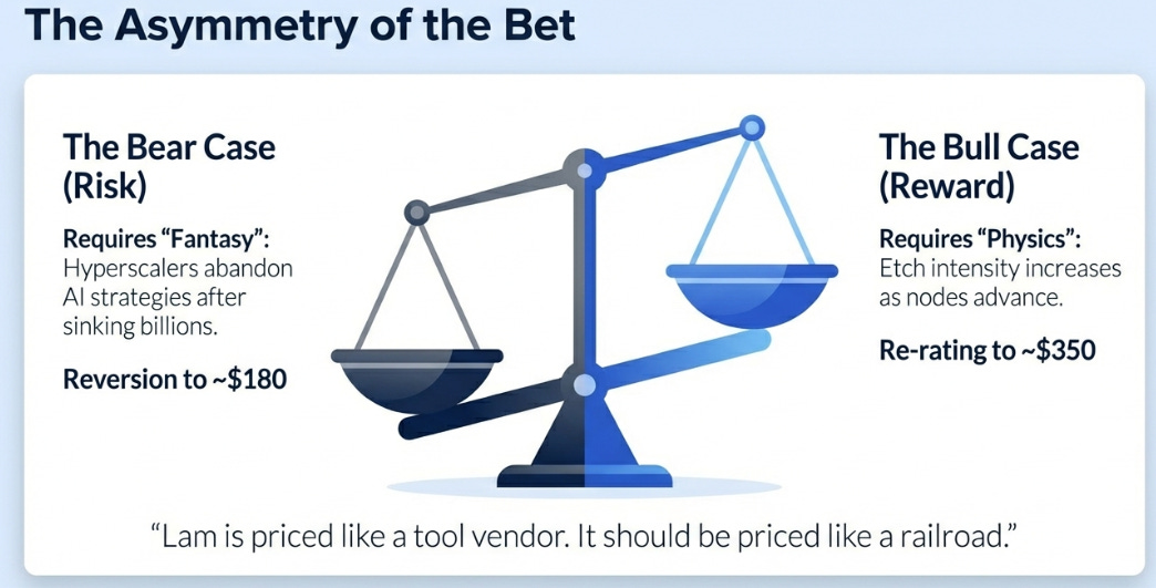The asymmetry favors the buyer because the downside requires fantasy while the upside requires only that physics remains physics. Moore’s promise didn’t break. It evolved. And Lam Research collects the toll on that evolution.