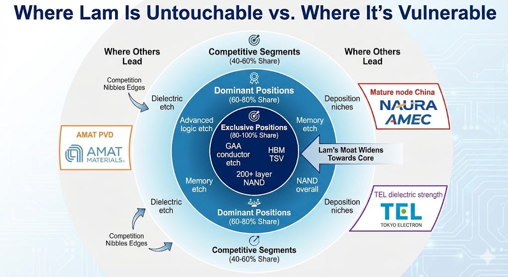 When you examine Lam’s competitive position, one pattern emerges: competitors can nibble at the edges, but they cannot touch what matters.