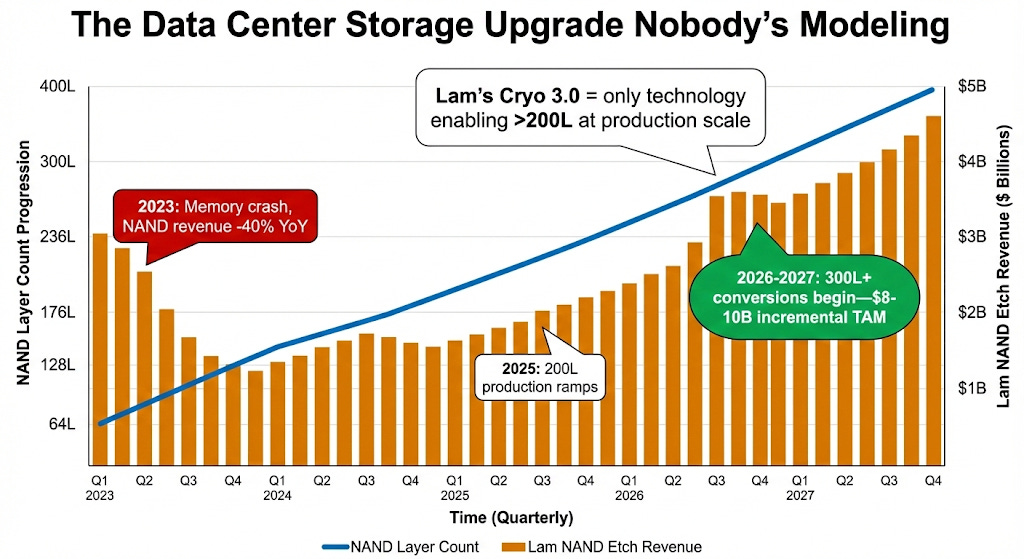 The setup is textbook: forgotten segment, structural catalyst, dominant market position, limited competition. When the NAND conversion cycle accelerates through 2026-2027, it layers on top of logic and DRAM growth already modeled. This isn’t replacing expected revenue, it’s adding to it.