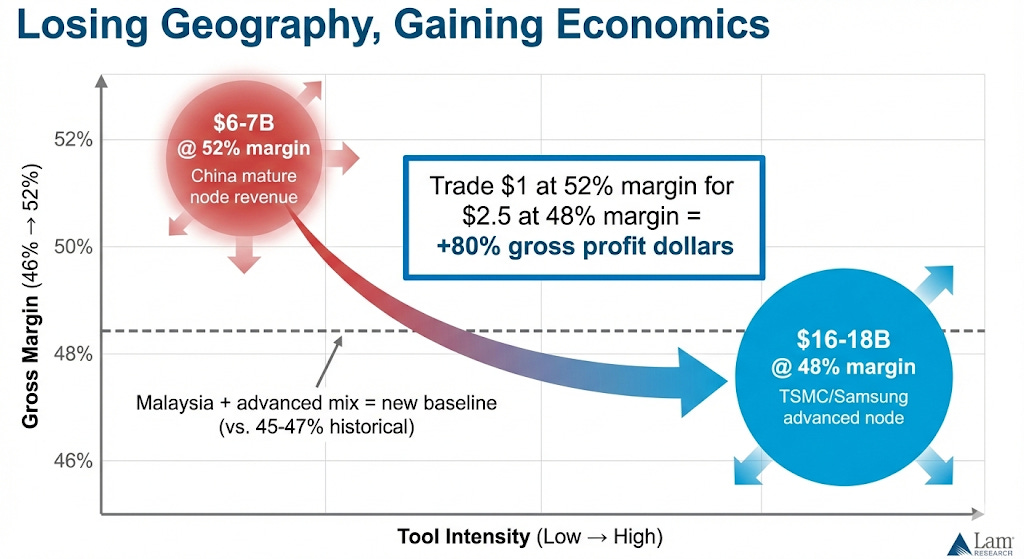But the 48.5% floor isn’t arbitrary, it’s structural. Lam’s Malaysia manufacturing facility, fully ramped as of Q3 2025, contributes 100+ basis points of permanent improvement versus pre-2023 cost structure. Advanced node tool mix adds another 100-150 basis points compared to mature node blends. The China margin premium (52% vs 48%) masked these operational gains. As China normalizes, the Malaysia efficiency becomes visible for the first time.
