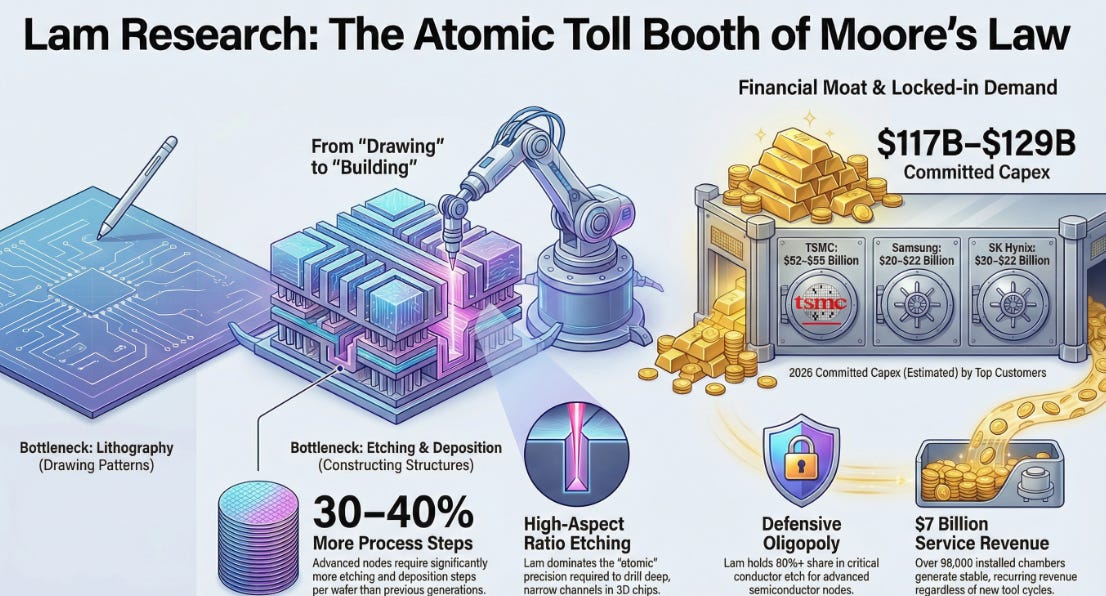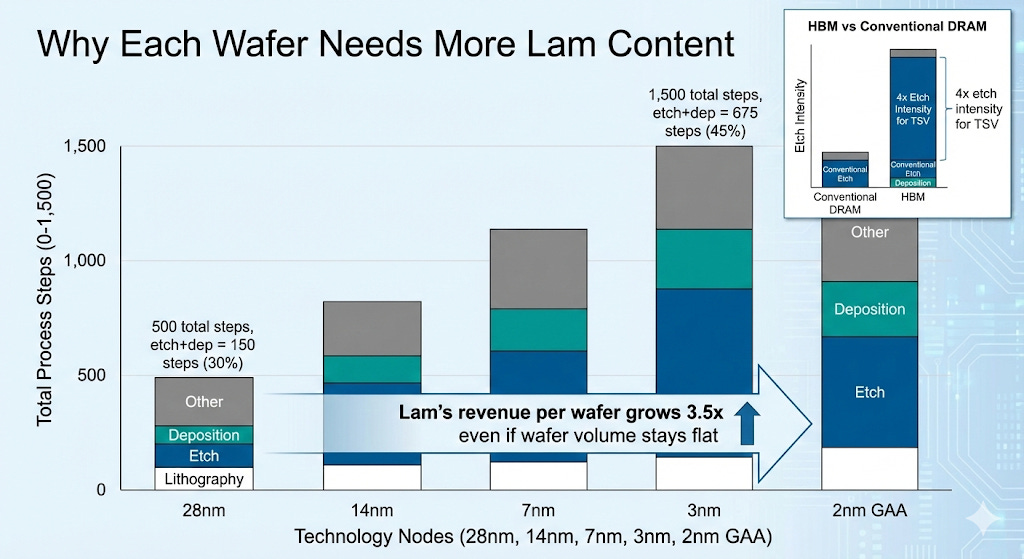 Advanced nodes now require 30–40% more process steps per wafer, centered on Lam’s strengths