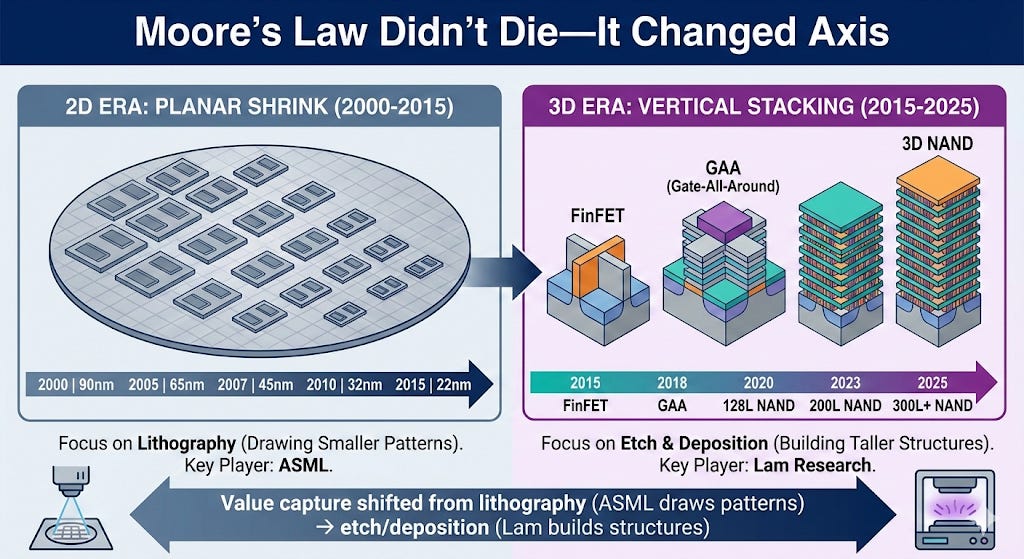 That someone is Lam Research. And Wall Street still prices them like a cyclical tool vendor because it hasn’t realized the bottleneck, and thus the value capture, has permanently shifted from patterning to building.