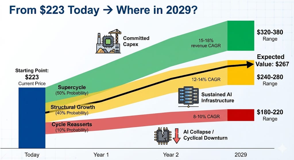 Current price $223 implies 20% upside to expected value over three years, approximately 6% annualized. Not cheap, not expensive. Fair value if you believe the base case. Compelling if you believe the supercycle. Dangerous if you believe the cycle reasserts.