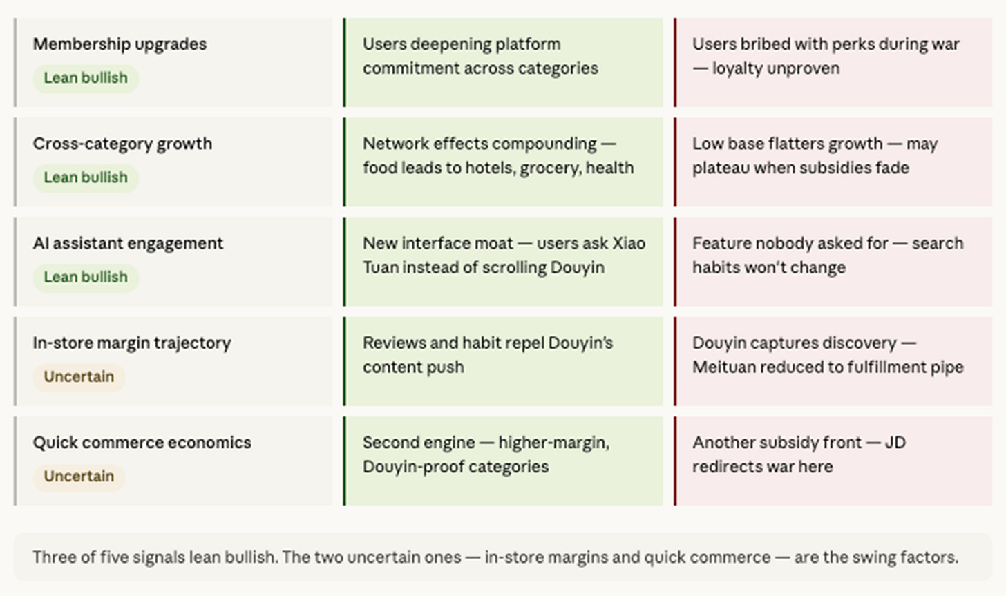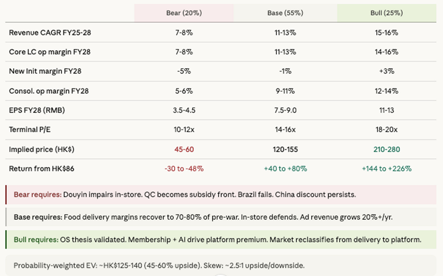 My overall conviction: moderately bullish, but with less certainty than six months ago. The moat thesis is stronger, the stress test proved the network is durable. The margin thesis is weaker, the old economics are not coming back, and the Douyin front is a genuine new risk. At HK$86, the risk/reward still favors the patient investor. But you need to accept that you are buying a different company than the one that traded at HK$190, and that the path from here runs through 12-18 months of messy consolidated numbers before the operating system re-monetizes underneath.