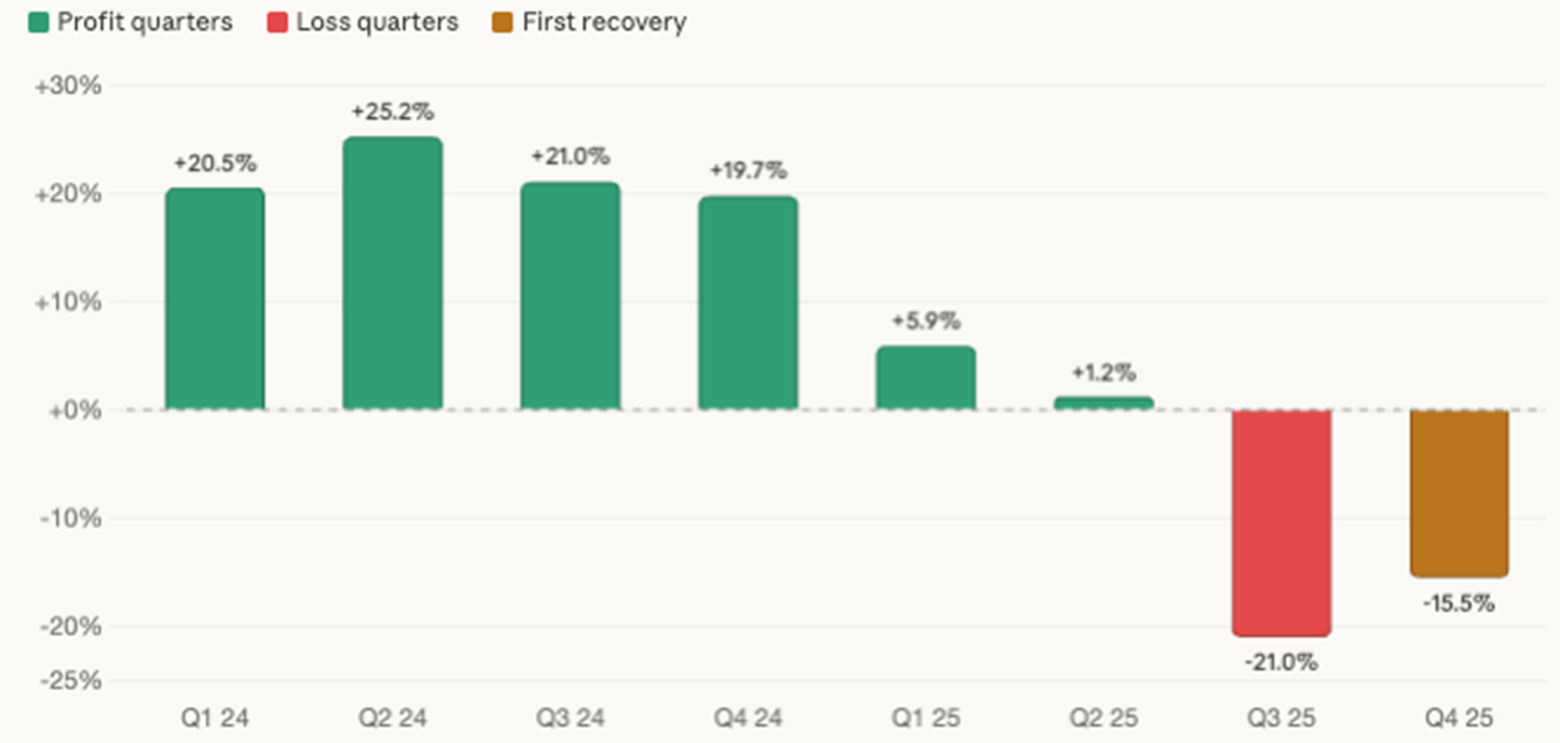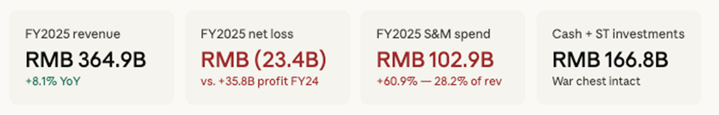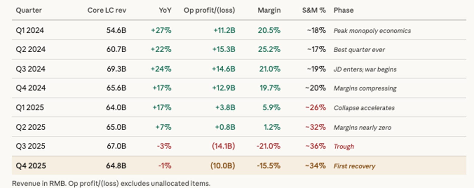Then, on March 26, Meituan delivered Q4 2025 results that were simultaneously ugly and encouraging, a combination only possible when expectations have been beaten into rubble by twelve months of corporate bloodletting. Revenue grew 4.1% to RMB 92.1 billion. The net loss was RMB 15.1 billion. And the Core Local Commerce segment, the business that actually matters, posted a loss of RMB 10.0 billion, down from Q3’s record RMB 14.1 billion.