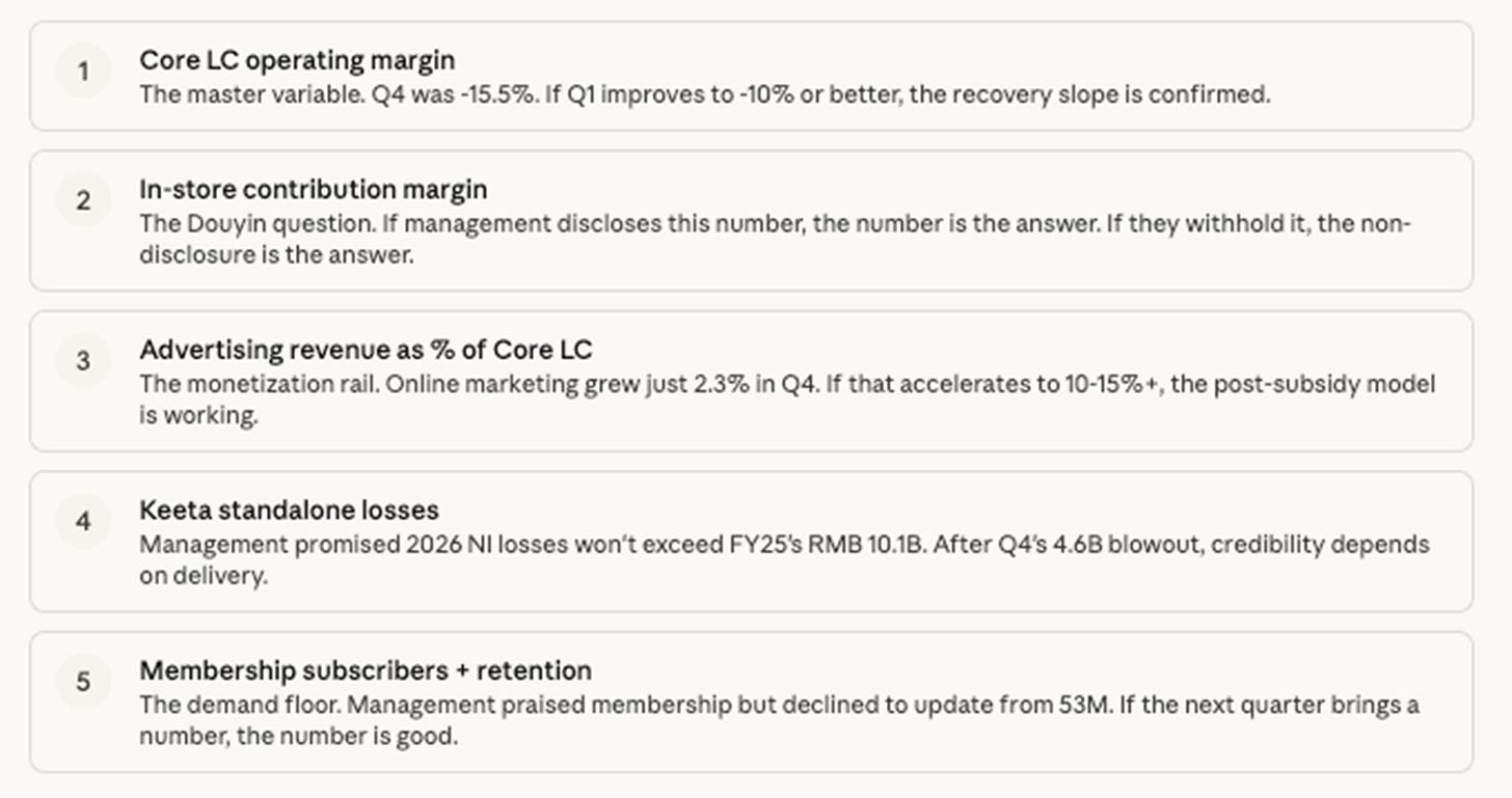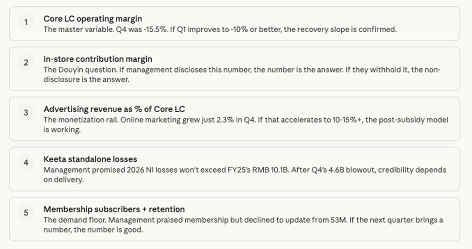 Third, and this is the detail the market has not processed, management highlighted that delivery services revenue increased sequentially from Q3 to Q4. That means the AOV trough has passed. When delivery revenue is growing quarter-over-quarter while the company is simultaneously cutting subsidies, the per-order economic inflection has likely occurred. CEO Wang Xing confirmed this on the call: “We are on track to see a more meaningful sequential improvement in our food delivery per-order loss in Q1 versus Q4 last year.”