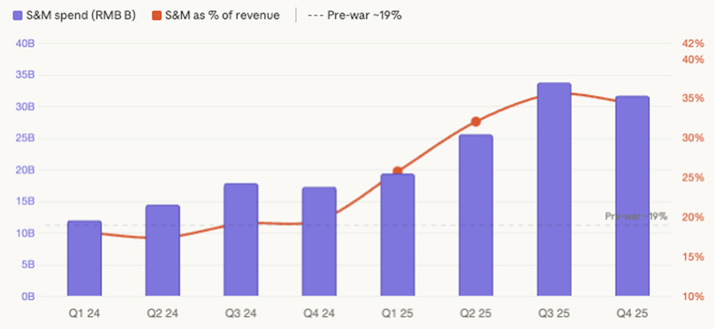 Where we were too optimistic was on the shape of the post-war market. We implied that margins would largely snap back once the math forced competitors to retreat. The Q4 data tells a different story. Core LC revenue fell 1.1% year-over-year despite healthy order and GTV growth, because incentives compressed the revenue Meituan could recognize per transaction. Selling and marketing expenses consumed 34.4% of Q4 revenue, nearly double the pre-war 18-19%. Full-year S&M spending exploded 61% to RMB 102.9 billion, eating nearly all of the gross profit.