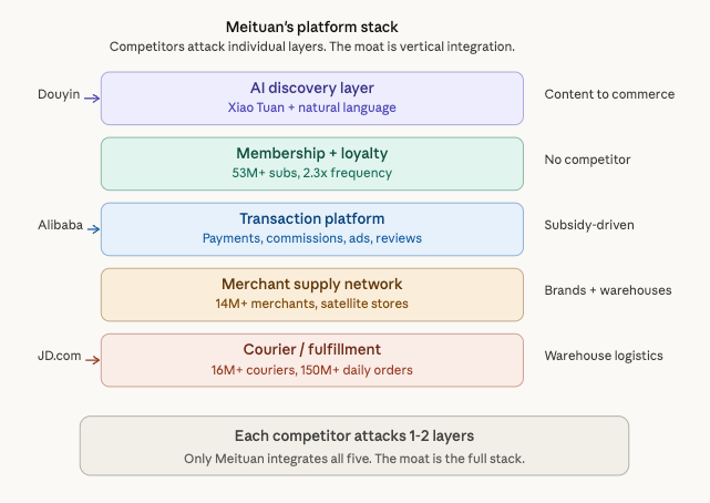 The market classifies Meituan as a food delivery company with temporarily bad margins. I think this is a classification error. I think Meituan is the operating system for local commercial life in urban China, the default interface through which consumers discover, evaluate, transact with, and receive services from the physical world around them. Delivery is the backbone, but it is not the product. The product is the relationship: the membership that ties you to the platform, the reviews that make you trust its recommendations, the AI assistant that knows what you need, and the courier network that makes everything available in 30 minutes.