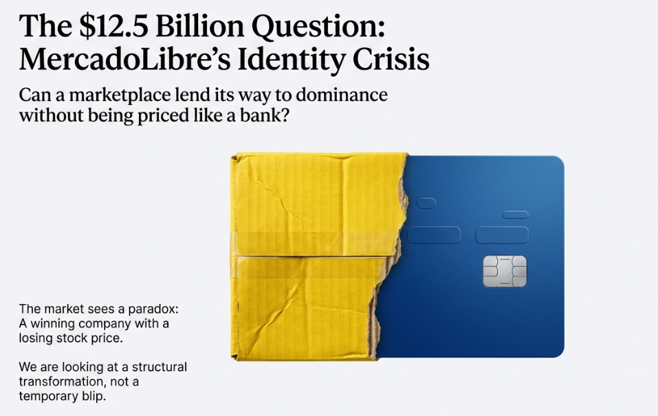 This is a re-categorization, not a slowdown. MELI isn’t being repriced as weaker e-commerce. It’s being repriced as a capital-intensive LatAm lender. The market doesn’t know how to value a 45%-growth tech platform that also runs a rapidly scaling balance sheet.