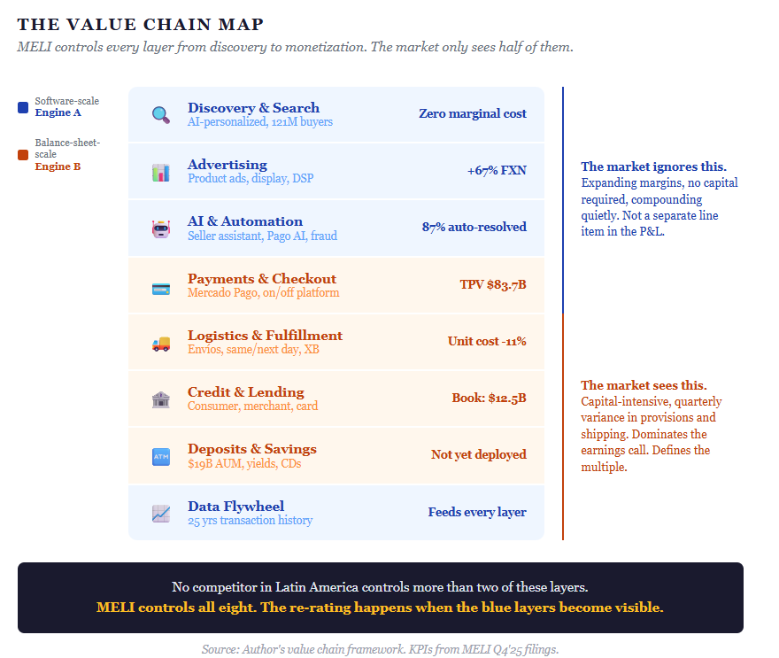 Engine A is software-scale. Marketplace take rates, advertising growing 67% FXN on near-zero marginal cost, AI tools, the seller assistant now touches 20% of GMV, the Pago AI assistant resolved 87% of 9M+ conversations in Q4 without a human, and the data flywheel that improves with every transaction across 121 million buyers. Engine A has expanding margins, no capital consumption, and no macro sensitivity. It compounds quietly.