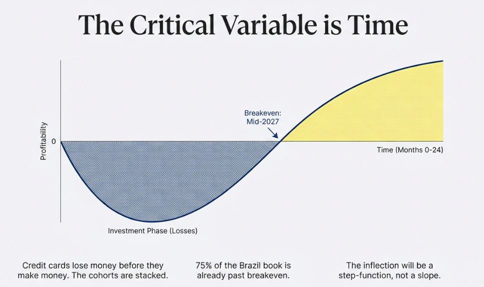 The variable that resolves this tension is time. The credit card maturation curve suggests the full portfolio crosses NIMAL breakeven by mid-2027 at current rates. When it does, 2-3 percentage points of operating margin appear as a step-function, not gradual improvement, but a visible inflection that changes the earnings profile of the entire company. The credit card doesn’t get 5% better each quarter. It loses money for 18-24 months, then it makes money. The cohorts are stacked. The crossover, when it comes, will be sudden.