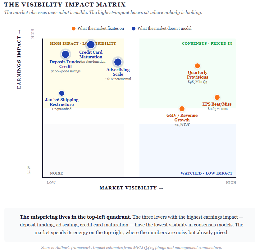 Deposit-funded lending. Mercado Pago sits on $19B in assets under management that are not being used for credit funding. CFO Osvaldo Giménez confirmed on the call they are “not doing fractional banking.” When MELI eventually funds 20-30% of the credit book from deposits rather than wholesale markets, borrowing costs drop by $200-400M annually. No sell-side model includes this optionality.