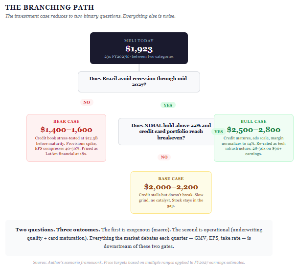 If macro turns before the book seasons: Bear case, $1,400-1,600. Brazilian recession stress-tests $12.5B in consumer credit before the card portfolio reaches breakeven. Provisions spike, EPS compresses 40-50%, the market prices MELI as a LatAm financial at 18x depressed earnings.