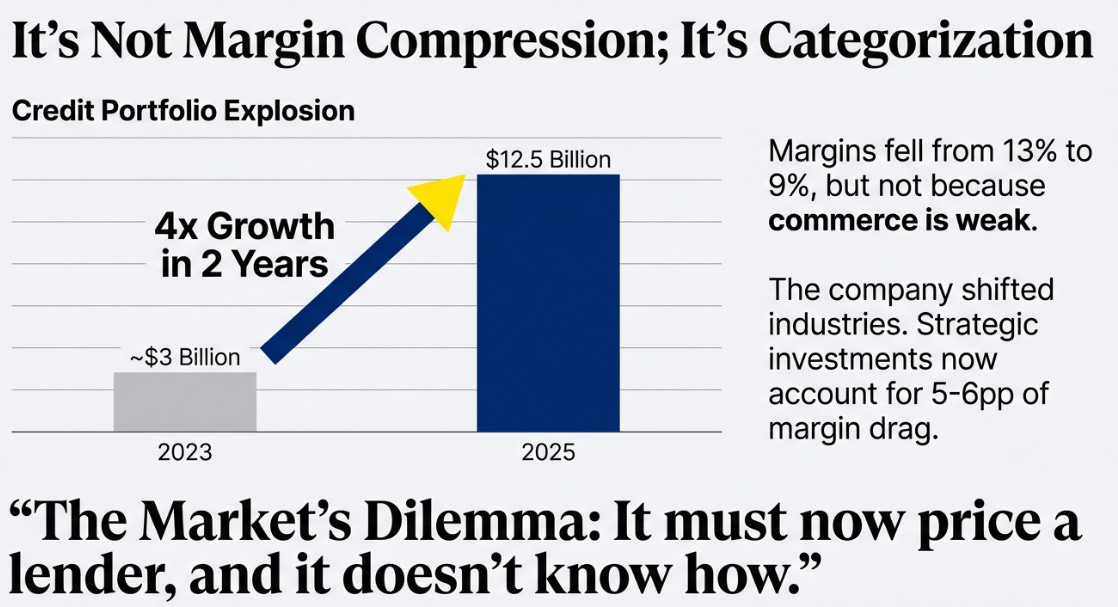 A year ago we wrote that margin compression was the strategy, not the problem. That was right about commerce. What we didn’t appreciate was that the same company was simultaneously building a $12.5B lending operation that would change how the market categorizes the entire business. We were watching the logistics war. The credit transformation happened in peripheral vision.