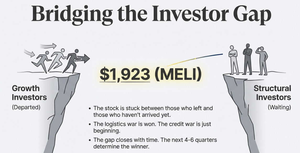 At $1,923 and 23x FY2027 consensus, the stock is stuck between two investor bases that don’t overlap. The tech growth investors who owned MELI at $2,700 fled when margins fell from 13% to 9%, they wanted operating leverage, got operating deleverage, and moved capital to companies where AI is expanding margins rather than compressing them. The structural utility investors who should own MELI at $1,900, pricing it as a 45%-growth integrated commerce-fintech platform with 78 million financial users and leading NPS in four countries, haven’t arrived because they need to see the credit book survive a full cycle before they’ll underwrite a financial institution at this scale.