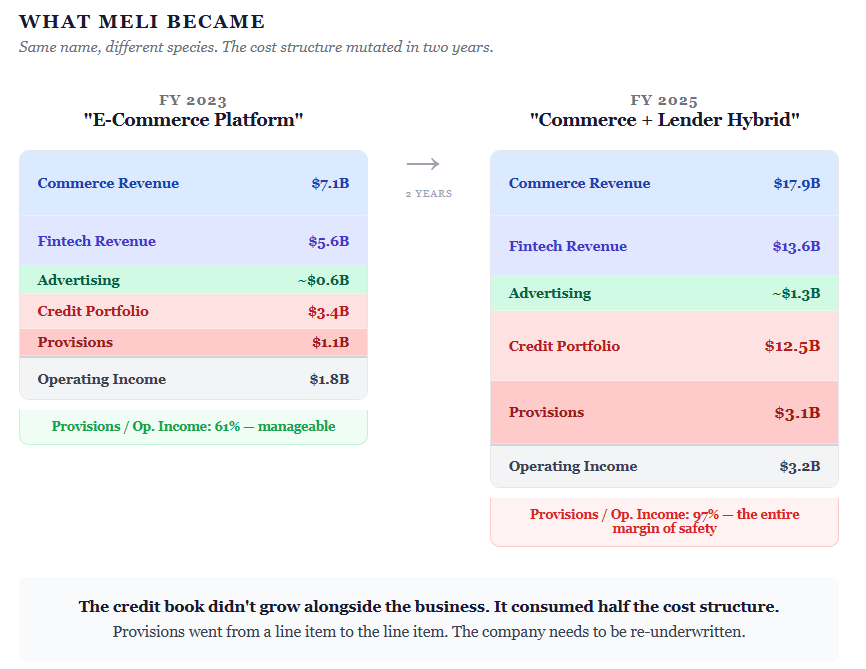 The market used to price MELI as a capital-light e-commerce compounder, a 35x earnings business with software-like margin expansion ahead. It now has to price a capital-intensive Latin American lender. Those are different businesses deserving different multiples. That recategorization, not the commerce margin compression we spent a year writing about, is why the stock fell from $2,700 to $1,900 while the Bovespa rallied and revenue accelerated.