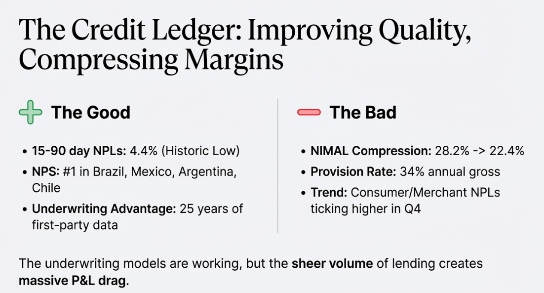 What’s improving: Credit card 15-90 day NPL hit 4.4% in Q4, a historic low, improving for the fifth consecutive quarter. Brazilian card cohorts older than two years are profitable on a net interest margin basis, with roughly 75% of the Brazil book past breakeven. MELI issued 3 million credit cards in Q4, up from 1.5M in Q2, with improving unit economics at each step. The underwriting models, built on 25 years of first-party transaction data, are producing better results as they scale. Mercado Pago achieved the leading Net Promoter Score among all financial institutions in Brazil, Mexico, Argentina, and Chile simultaneously, a trust advantage that took years to build and cannot be replicated by partnership.