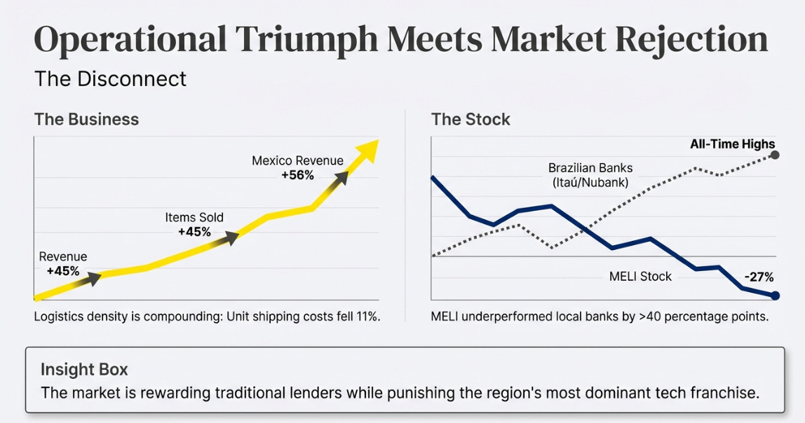 Meanwhile, MercadoLibre, the most dominant technology franchise in Latin America, growing revenue 45% with leading market share across every geography and product vertical, peaked at $2,700 last April and now trades at $1,923. The stock underperformed Brazilian banks by over 40 percentage points in the past year. A company growing revenue three to four times faster than the index is being treated as the worst-performing asset class in the region.