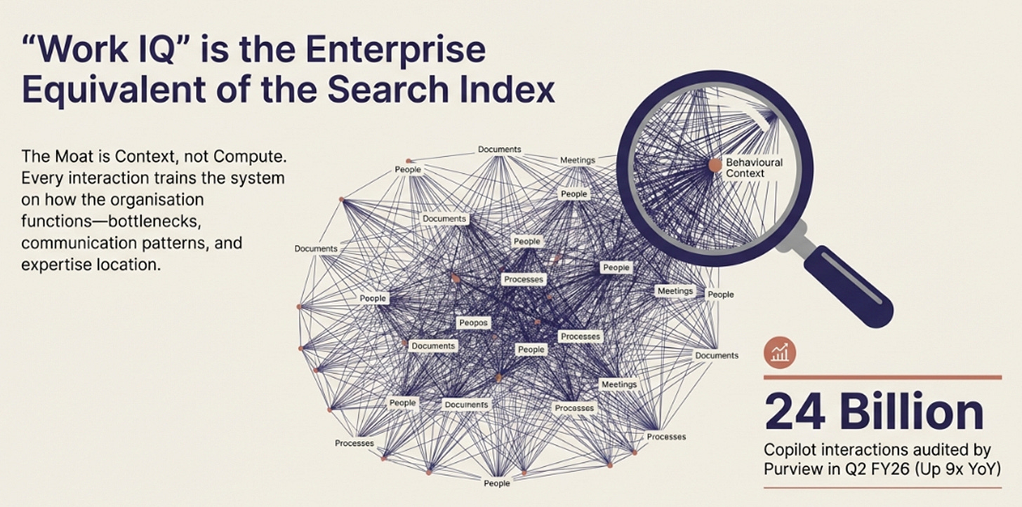 Microsoft’s Purview compliance platform audited 24 billion Copilot interactions in Q2 FY26, up 9x YoY. That’s not just a security metric, it’s the new perimeter being built. Every interaction trains the system on how work flows through the organization: who needs what information, which processes bottleneck, what communication patterns indicate progress.
