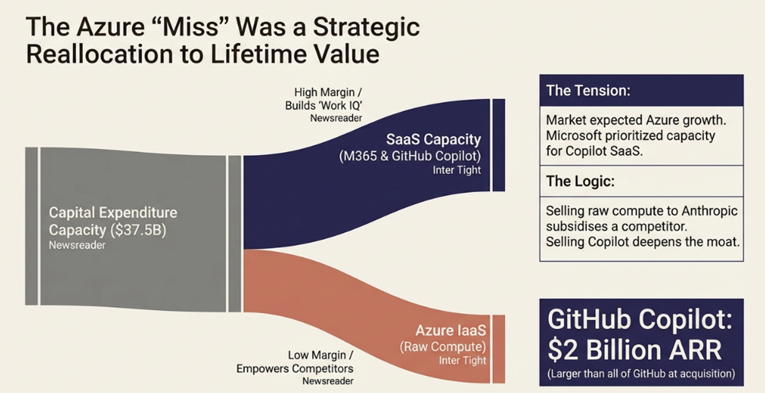 The market wanted Microsoft to maximize one number: Azure growth. Microsoft was optimizing lifetime value across the integrated platform. The $2 billion GitHub Copilot business validated the allocation.