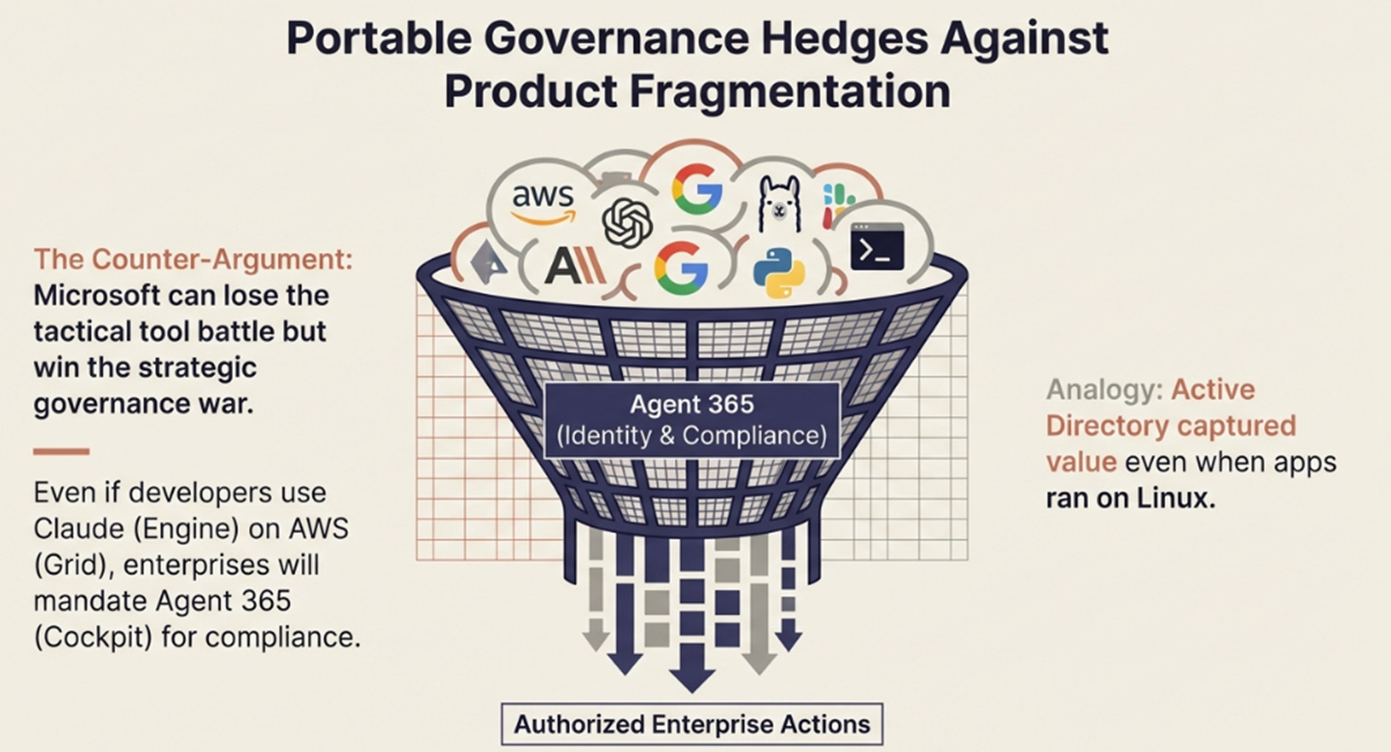 Microsoft may achieve the strategic goal while losing tactical battles. The Cockpit can win even if the Grid faces margin pressure and the Engine becomes multi-sourced. Agent 365 making governance portable means Microsoft captures value even when they don’t own the compute or the preferred developer tool.