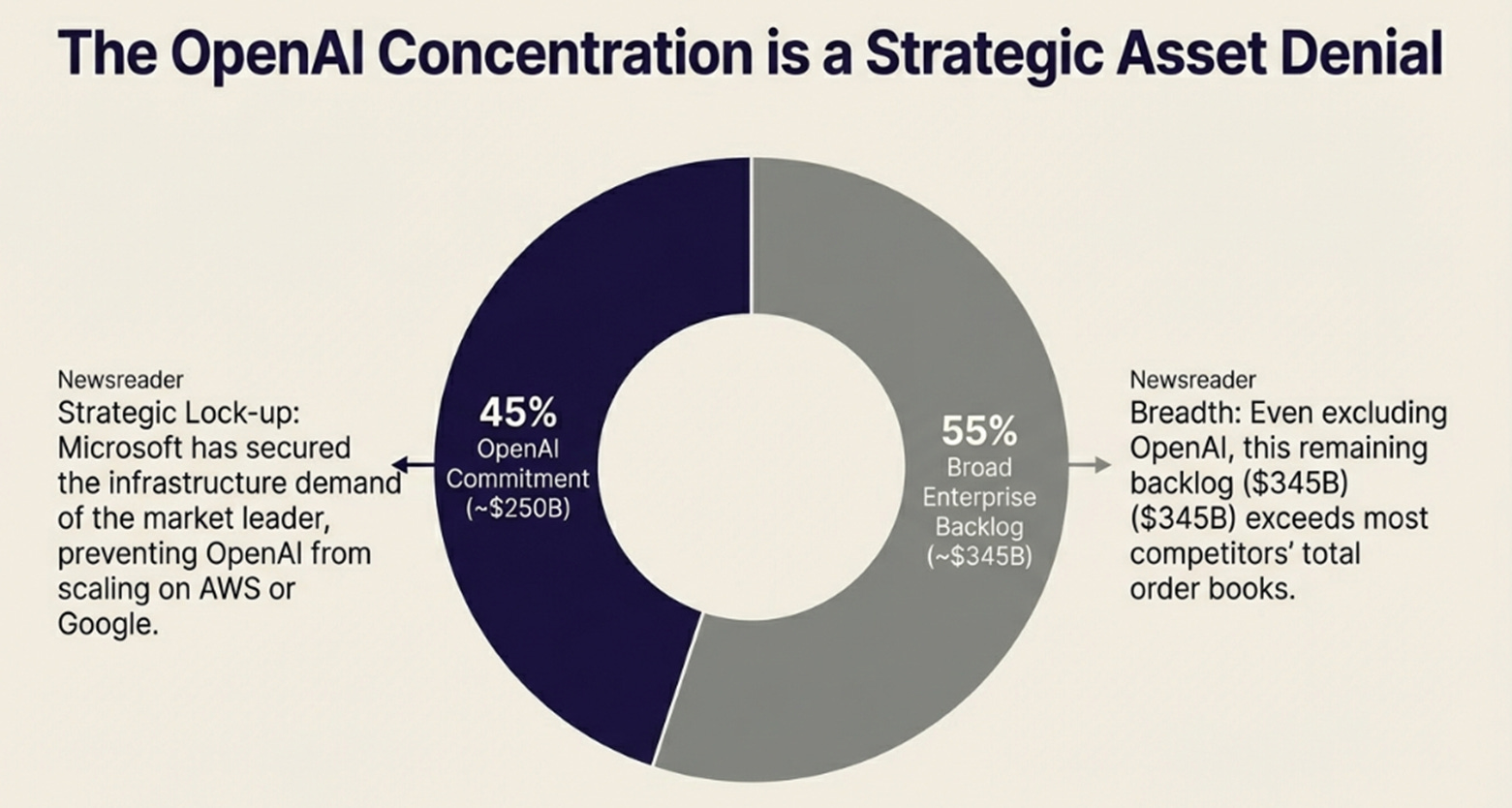 Immediate reaction focused on concentration: OpenAI represents roughly 45% ($250+ billion) through a multi-year Azure commitment. Surface reading: dangerous single-customer dependency.