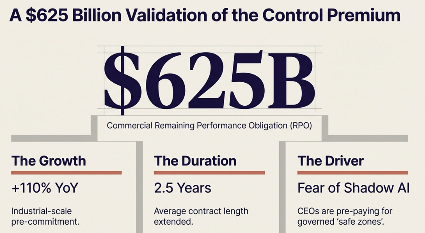 $625B in backlog is the proof. Enterprises are pre-paying for governed AI environments, validating that the control premium survives even as compute and models commoditize.