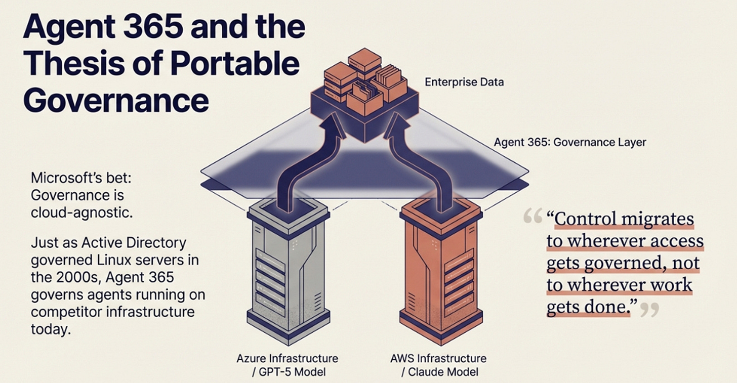 Agent 365 makes governance portable. Microsoft’s bet isn’t that AI runs on Azure, it’s that every agent, anywhere, must authenticate through Microsoft’s control plane.