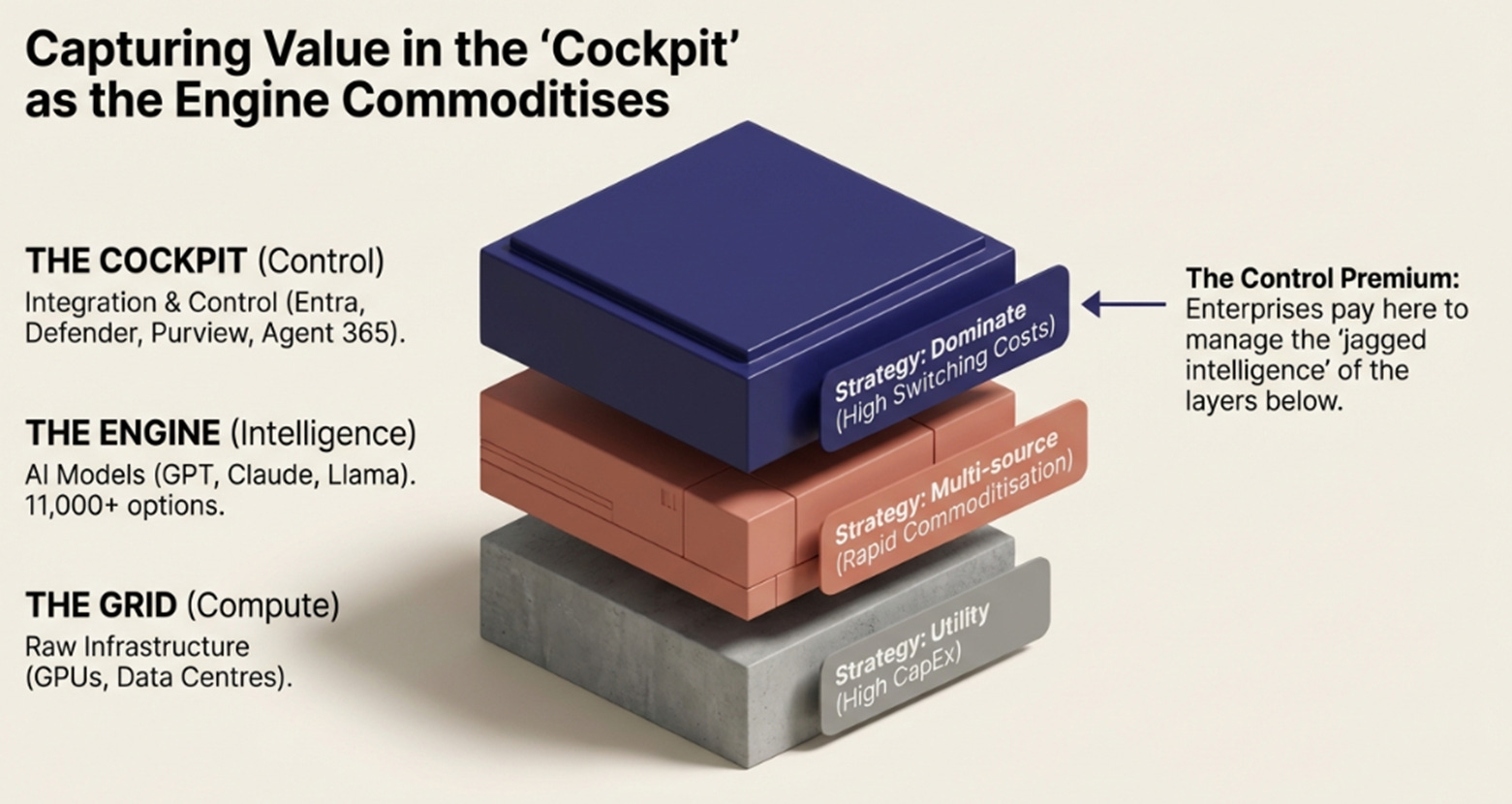 Microsoft’s approach: dominate the Cockpit while being good-enough at the Grid and multi-sourcing the Engine. Capture the control premium at the governance layer.