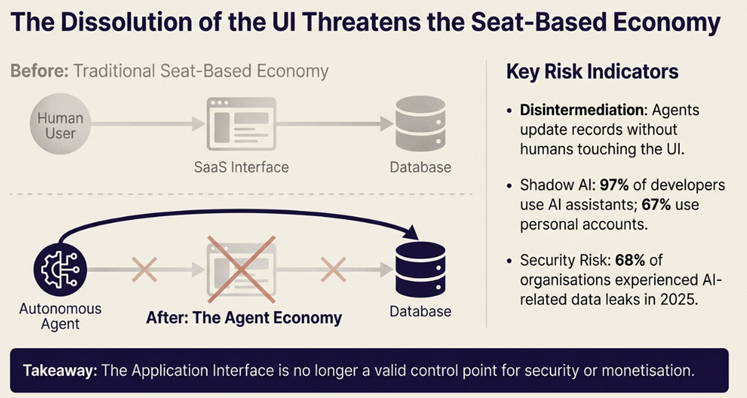 The economic implication: if an agent reads your Salesforce database and updates records without a human opening the UI, why does that human need a license? Salesforce and Adobe sold off in early 2026 on “seat disintermediation.” The per-seat pricing model that built SaaS assumes humans logging in and clicking. Agents bypass that entirely.