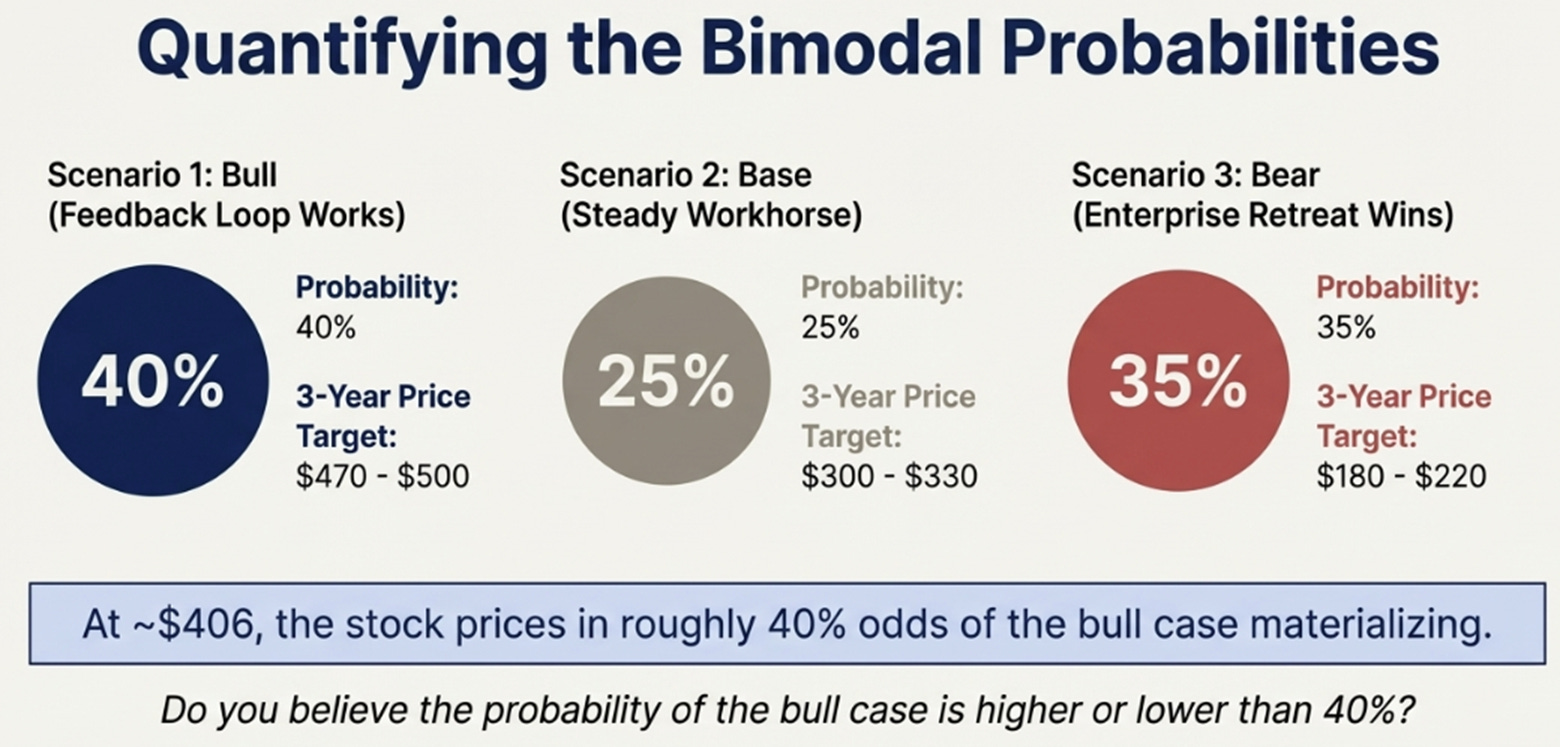 At $406, the stock prices in roughly 40% odds of the bull case. If you believe it’s higher than that, the stock is cheap. If you believe it’s lower, the stock is expensive. But don’t fool yourself into thinking you’re buying a stable compounder — you’re making a bet on which tail materializes.