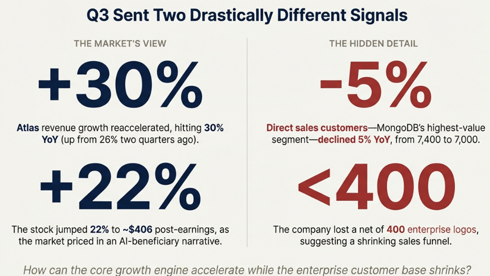 You could interpret this charitably: MongoDB is deliberately moving upmarket, focusing on larger deals rather than customer count. The 16% growth in customers spending more than $100K supports this view. Maybe losing 400 direct sales customers while growing large-account revenue is exactly the right trade.