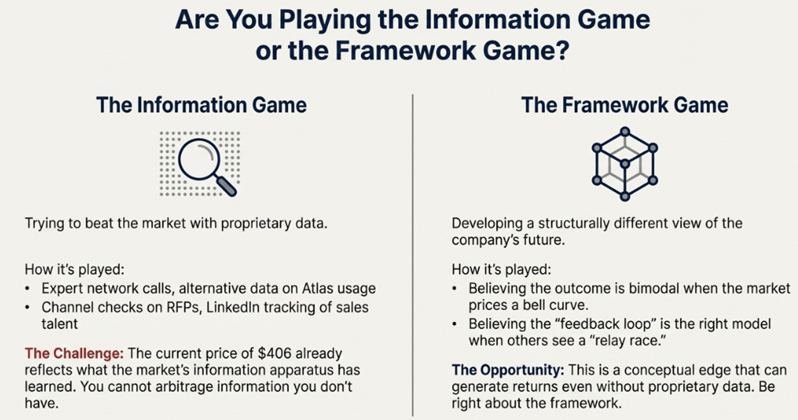 But be honest about which game you’re playing. If you’re betting on information, you’d better have information. If you’re betting on framework, you’d better be right about the framework.