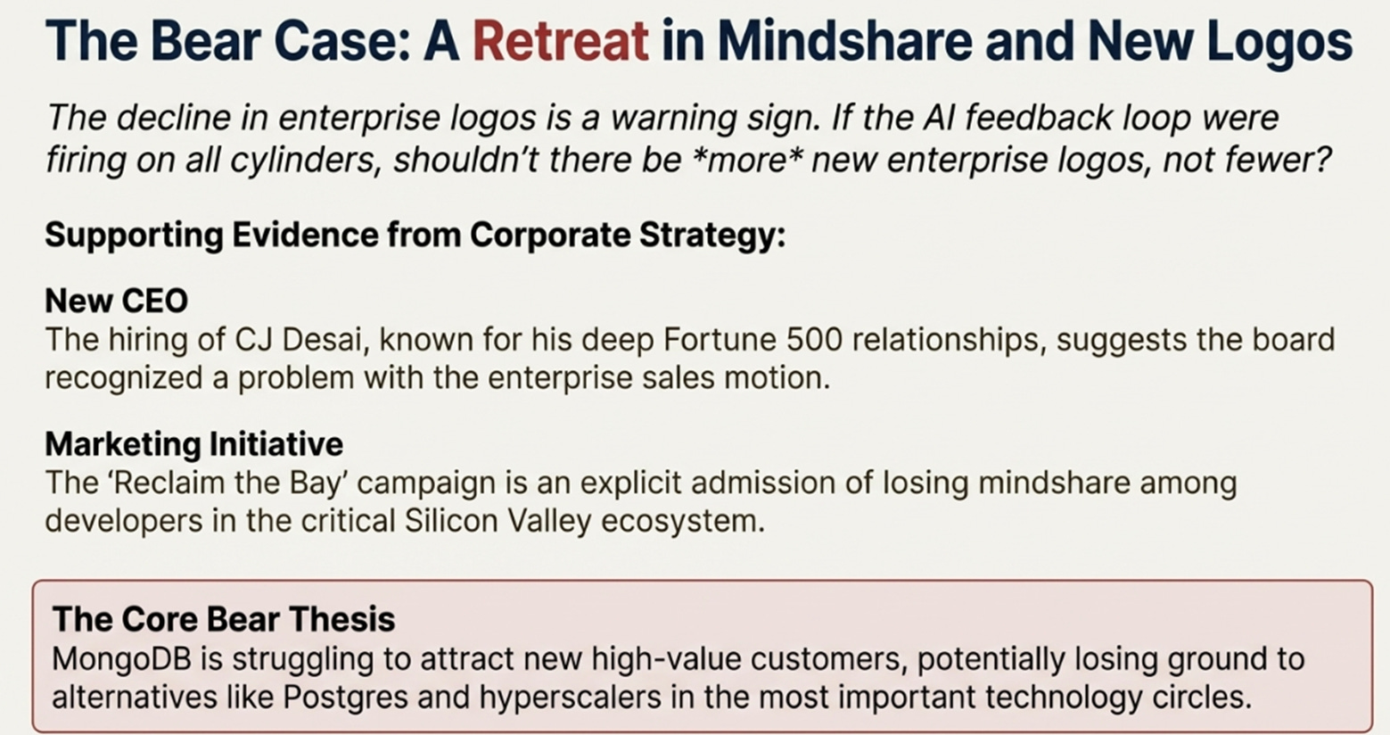 The fact that CJ Desai was hired specifically for his enterprise relationships suggests MongoDB’s board sees the funnel problem. You don’t bring in a CEO known for Fortune 500 relationships if your enterprise motion is working. The “Reclaim the Bay” initiative — a marketing campaign to win back Silicon Valley developers — is an even more explicit admission that MongoDB has lost mindshare in the most important startup ecosystem.