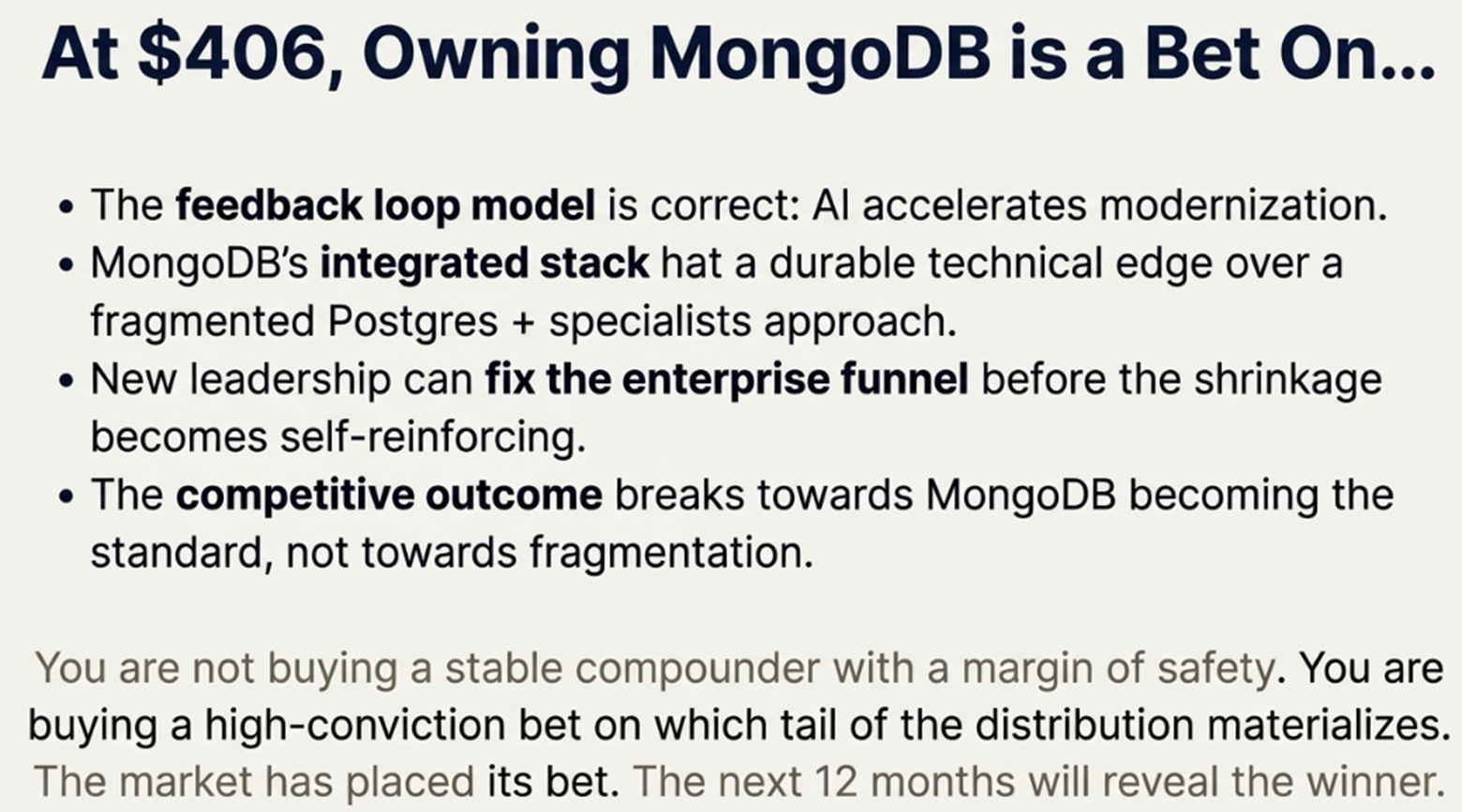 Here’s where most analysis goes wrong: the temptation is to split the difference. Maybe MongoDB grows 18% instead of 25%, margins expand gradually, and the stock trades sideways while the market waits for clarity. Call it the “steady workhorse” scenario.