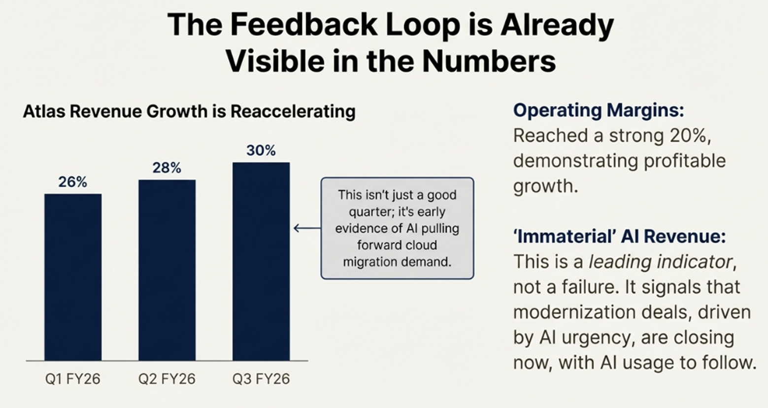 AI is speeding up modernization, not replacing it: Q3 suggests AI teams are forcing enterprises to modernize faster, turning Atlas into the early beneficiary even before AI revenue shows up.