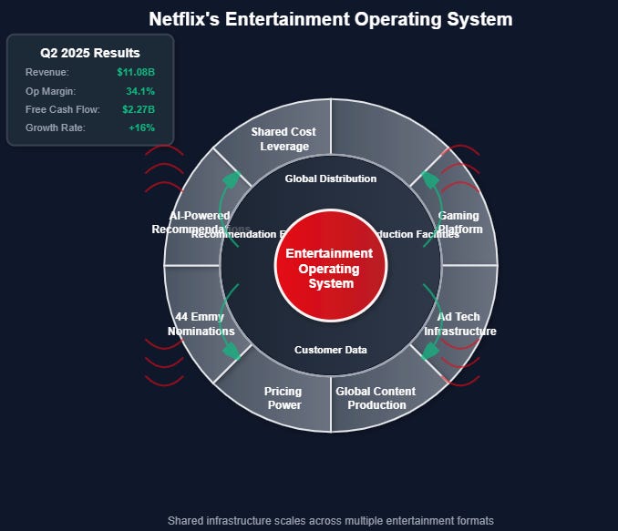 My first thought after reading Netflix's Q2 results was that this wasn't just another strong quarter — it was validation of the Entertainment Operating System thesis I've been tracking. While Wall Street focused on the revenue beat and raised guidance, the real story is how Netflix achieved 34.1% operating margins while simultaneously expanding into live sports, gaming, and advertising. That combination should be impossible under traditional media economics, yet here we are.