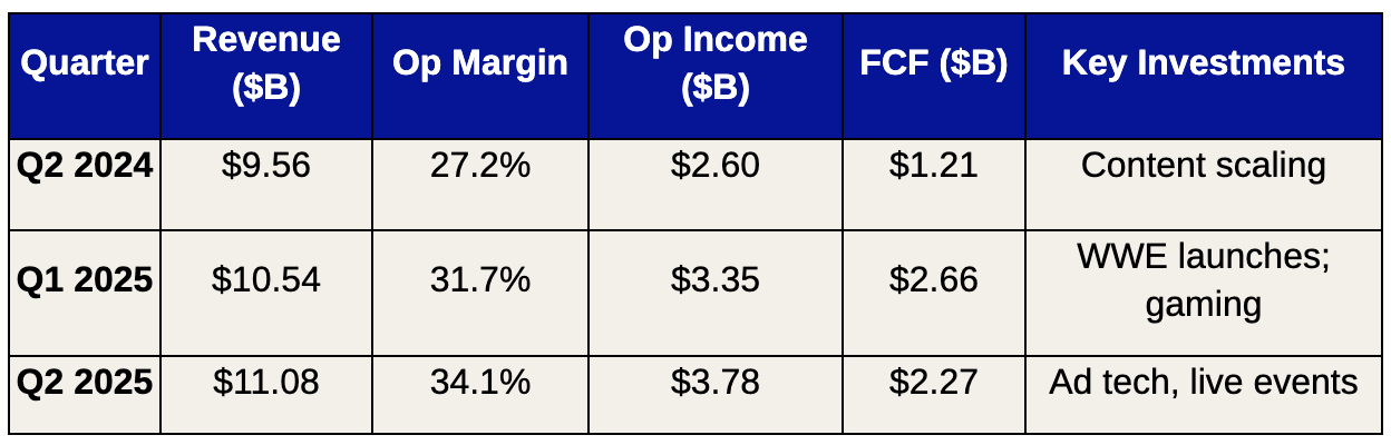 The most striking aspect of Netflix's results is achieving 34.1% operating margins (up from 27.2% a year ago) while making their most aggressive multi-format investments ever. This defies basic business logic, where expanding into new verticals typically compresses margins as companies climb learning curves.