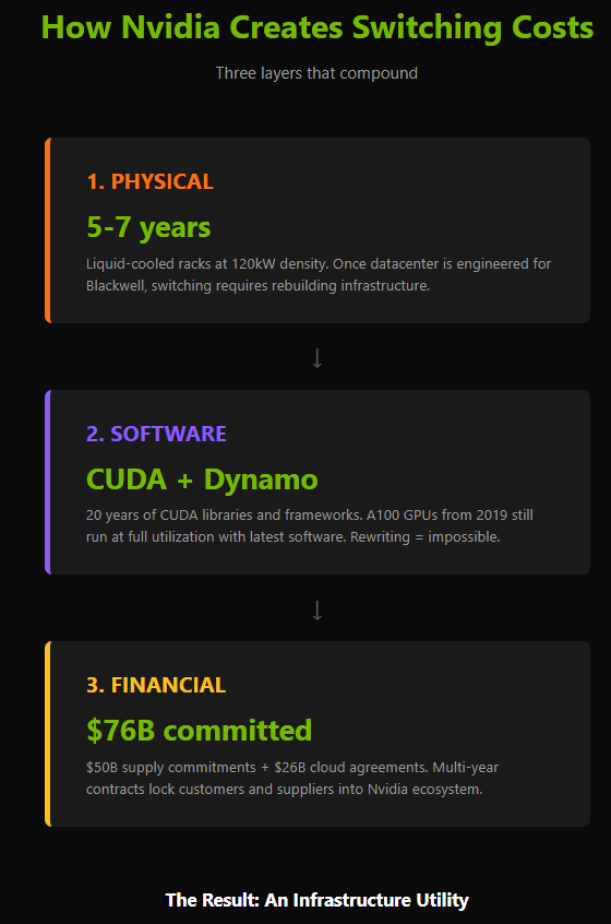 Understanding the demand side explains why growth continues. Understanding the supply side reveals why Nvidia believes it can sustain mid-70s gross margins even as competitors proliferate. The company is no longer just selling chips; it’s building something closer to an infrastructure platform with three layers of lock-in that compound on each other.