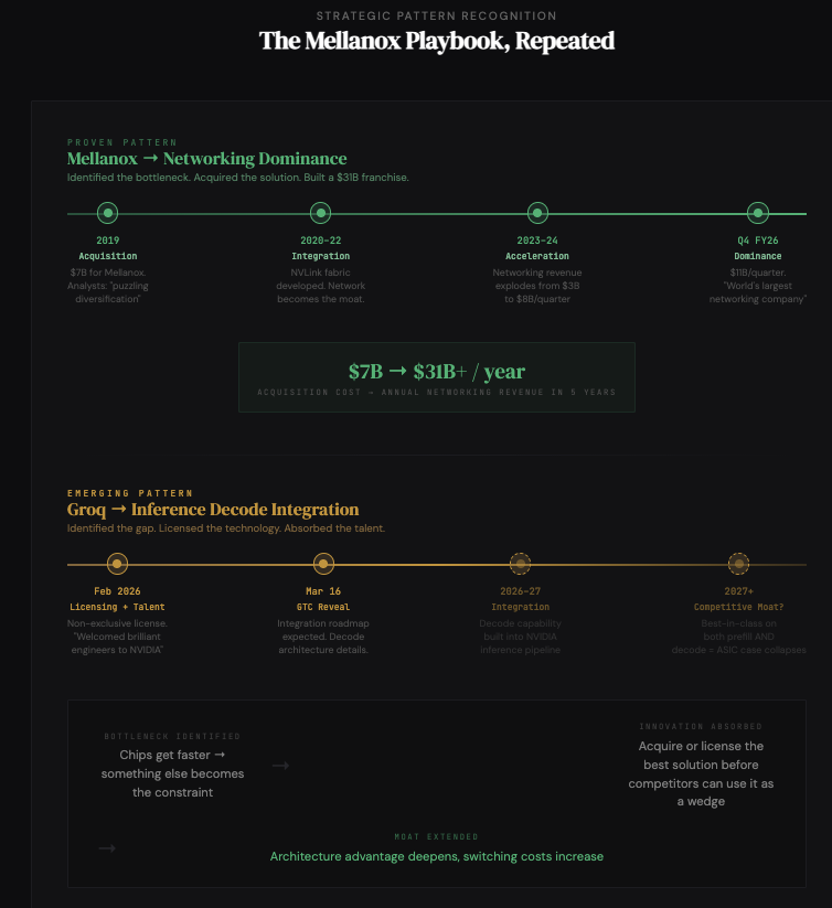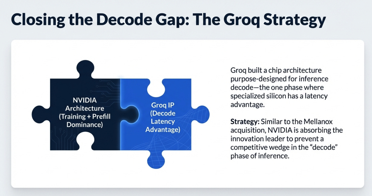 The Mellanox comparison is about strategic pattern, not deal structure. In 2019, NVIDIA recognized that as chips got faster, the network would become the bottleneck. They bought the best network company. Now, recognizing that reasoning models require new inference architectures, particularly for the decode phase where agentic systems spend most of their compute, they’re absorbing the innovation leader’s technology and talent.