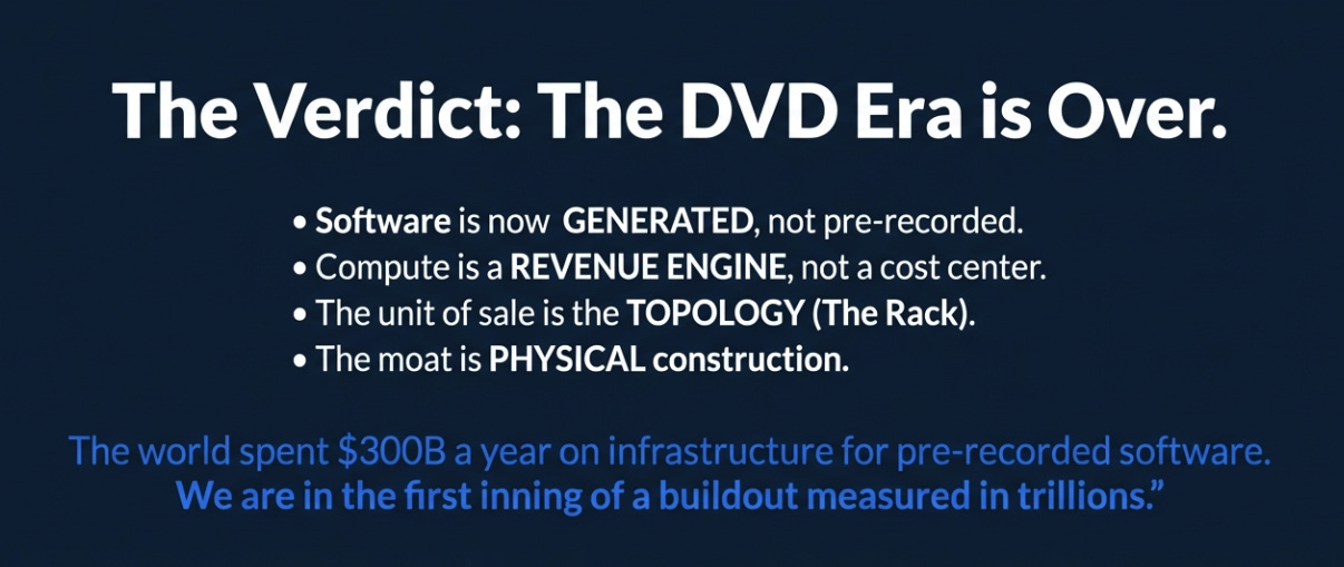 For fifty years, software has been pre-recorded. A developer writes code. It compiles. It runs the same way every time. The compute required to execute pre-written instructions is modest and predictable. This is Jensen’s DVD: press play, it runs, done.