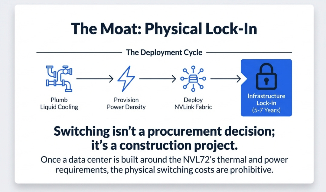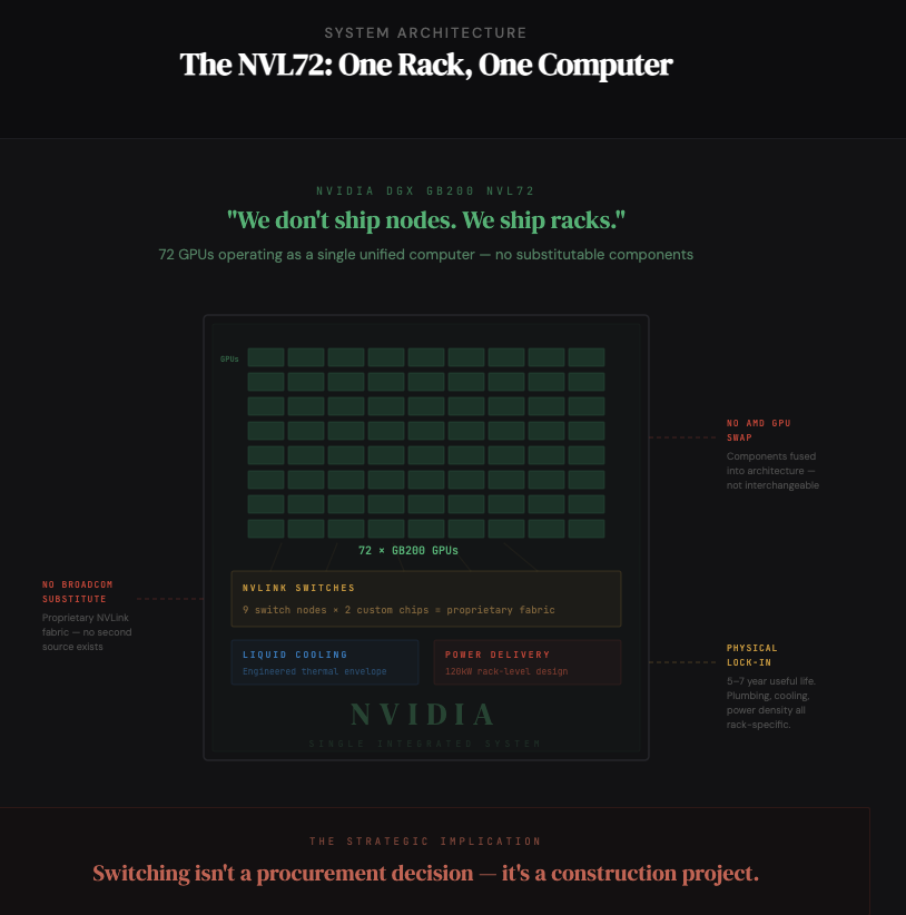 This is the moat shifting in real time. A customer can theoretically swap one GPU for another, it’s expensive, but architecturally possible. But once you’ve built your data center around NVL72 racks, plumbed the liquid cooling, provisioned the power density, deployed the NVLink fabric, you are physically locked in for the useful life of that infrastructure. Five to seven years. Switching isn’t a procurement decision; it’s a construction project.