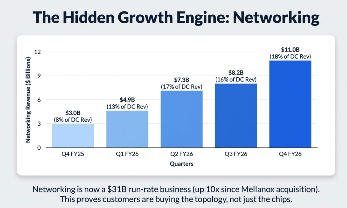 Networking revenue is the tell. It proves customers aren’t buying NVIDIA’s chips. They’re buying NVIDIA’s topology. And topology, unlike chips, has no second source.