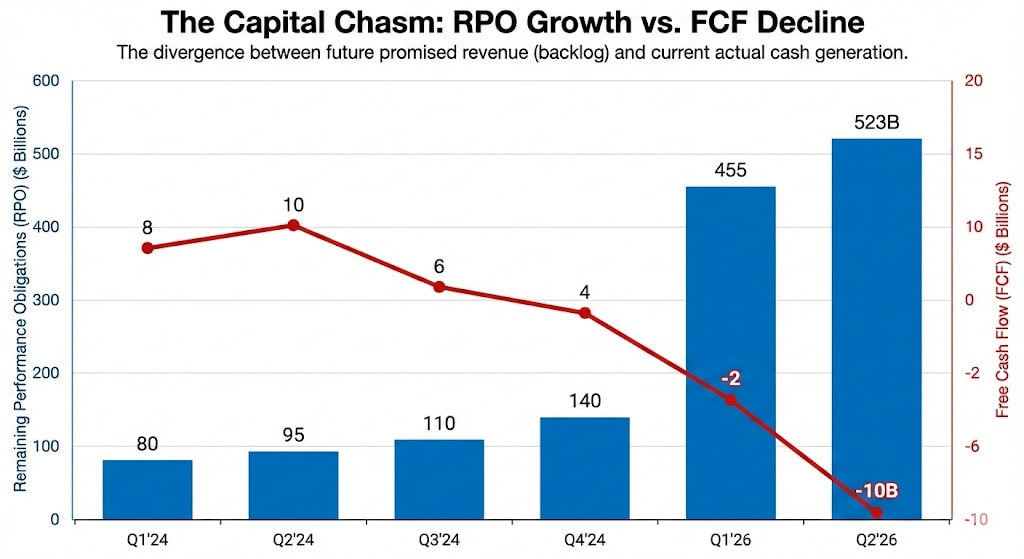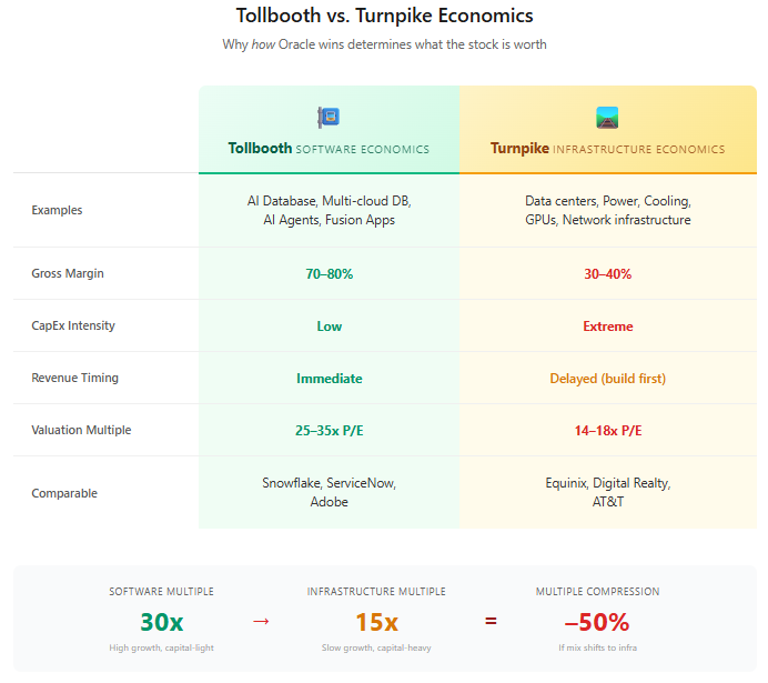 The tollbooth (database services, AI agents, multi-cloud distribution) is indeed high margin. But to get traffic to the tollbooth, Oracle must build the turnpike — the data centers, power infrastructure, cooling systems, and GPU clusters that AI workloads require. And turnpikes are expensive. The $523 billion in contracted revenue doesn’t flow to Oracle automatically; it flows only after Oracle spends tens of billions building the infrastructure to deliver it.