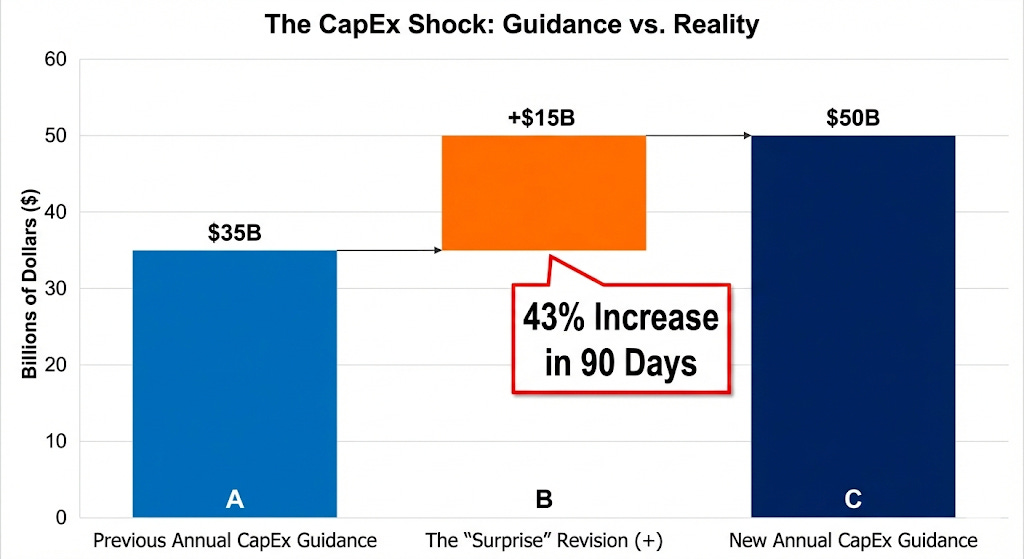 What the numbers actually showed was alarming. Capital expenditure hit $12 billion in the quarter, 45% above what analysts expected. Free cash flow was negative $10 billion, in a single quarter. And management raised full-year CapEx guidance by $15 billion, from roughly $35 billion to approximately $50 billion. That’s a 43% revision to a major guidance item just three months after they set it.