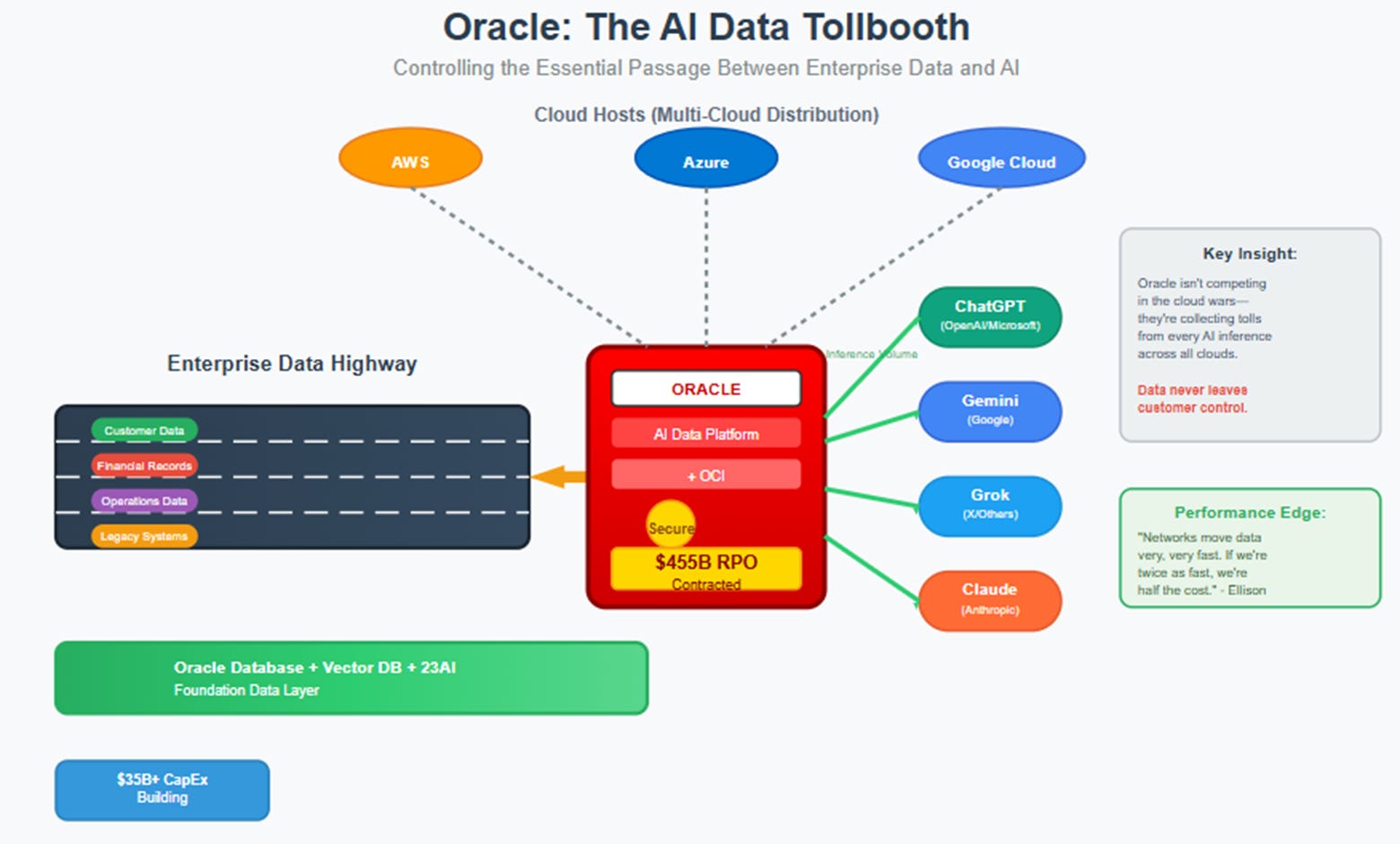 Oracle's success validates a broader strategic insight about platform competition: sometimes the best approach isn't building the biggest platform but making yourself indispensable to every platform. By positioning itself as the essential data-AI interface layer, Oracle captured value across the entire cloud ecosystem rather than competing directly with platform owners.